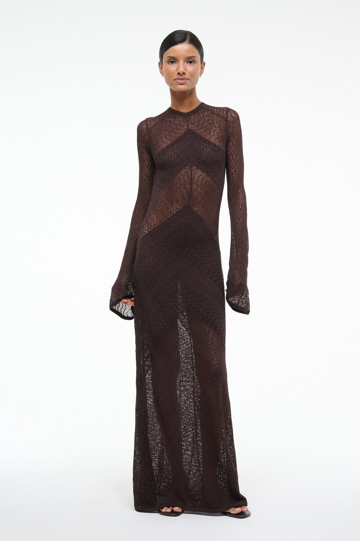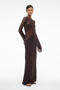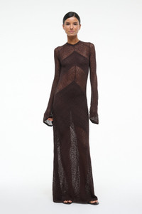 The Vera Dress is a sheer maxi dress in a knit pointelle. This style features long sleeves and an open back with a back neck tie. MORE DETAILS - 80% Viscose, 20% Nylon - Model is 5'9 and wearing a size S - Dry Clean Only