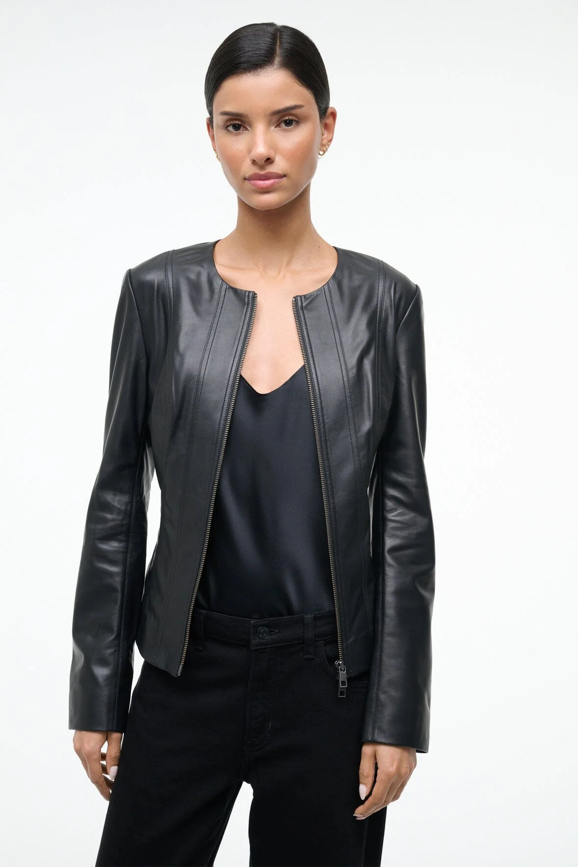The Wells leather jacket is crafted from supple leather and features a sleek round neckline and a zip front closure. Vertical seams create a flattering silhouette while adding subtle visual interest. MORE DETAILS - Self: 100% Lamb Leather, Lining: 100% Polyester - Model is 5'10 and wearing a size S - Dry Clean Only