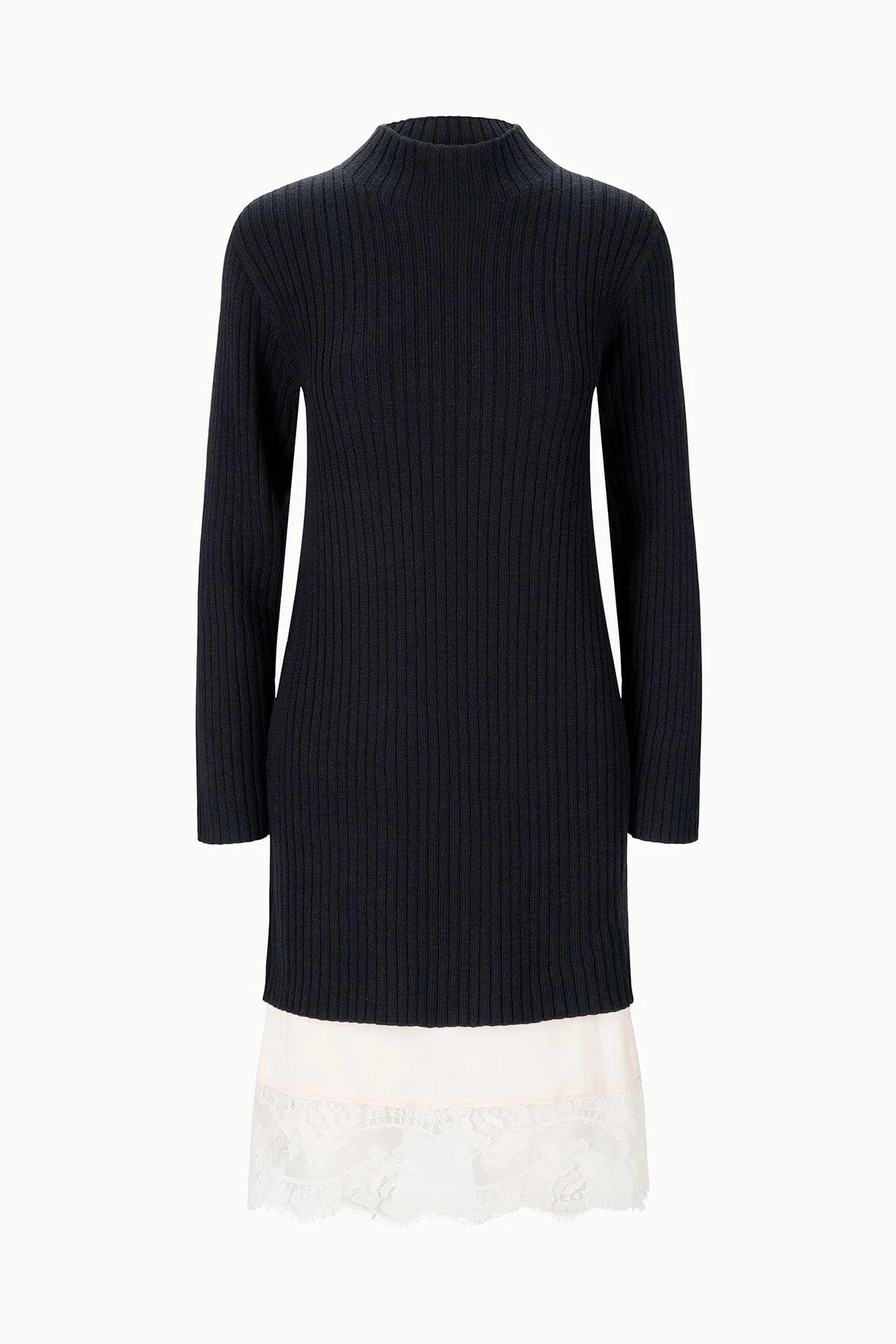 The Willow is a wool blend sweater dress that features a mock neck, long sleeves, and a layered contrast lace hem for pre-styled ease. MORE DETAILS - Self: 60% Wool, 40% Nylon, Lining: 100% Polyester, Trim: 100% Nylon - Model is 5'10 and wearing a size S - Dry Clean Only