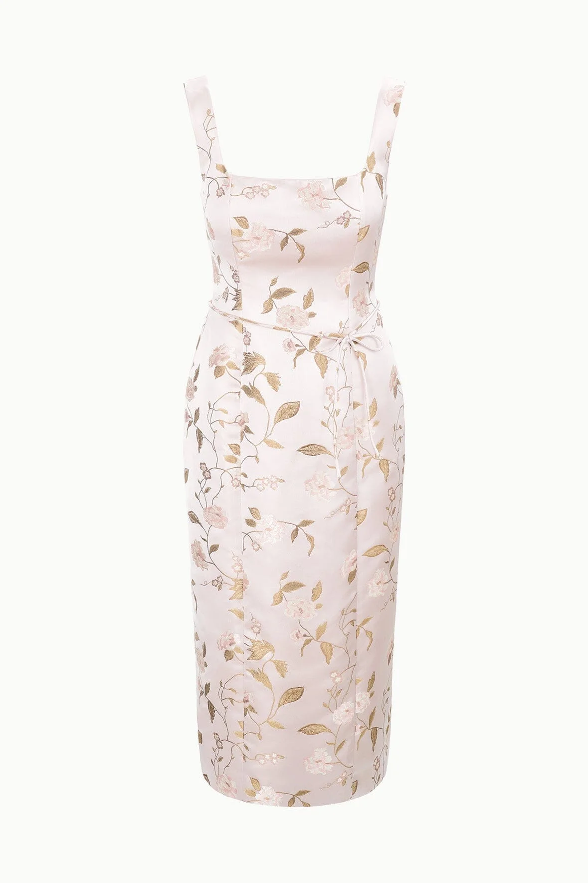 The Zoe Dress is a new floral brocade midi dress, featuring a fitted square neckline, a tie detail at the waist, and a tulip-shaped skirt. MORE DETAILS - 100% Polyester - Model is 5'10 and wearing a size 4 - Dry Clean Only