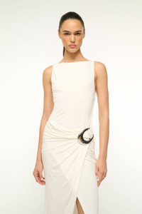 A sleeveless boatneck jersey dress, the Talia features a wrap skirt and oversized custom moon buckle hardware detail gathered at the waist. MORE DETAILS - 100% Viscose - Model is 5'10 and wearing a size Small - Dry clean only