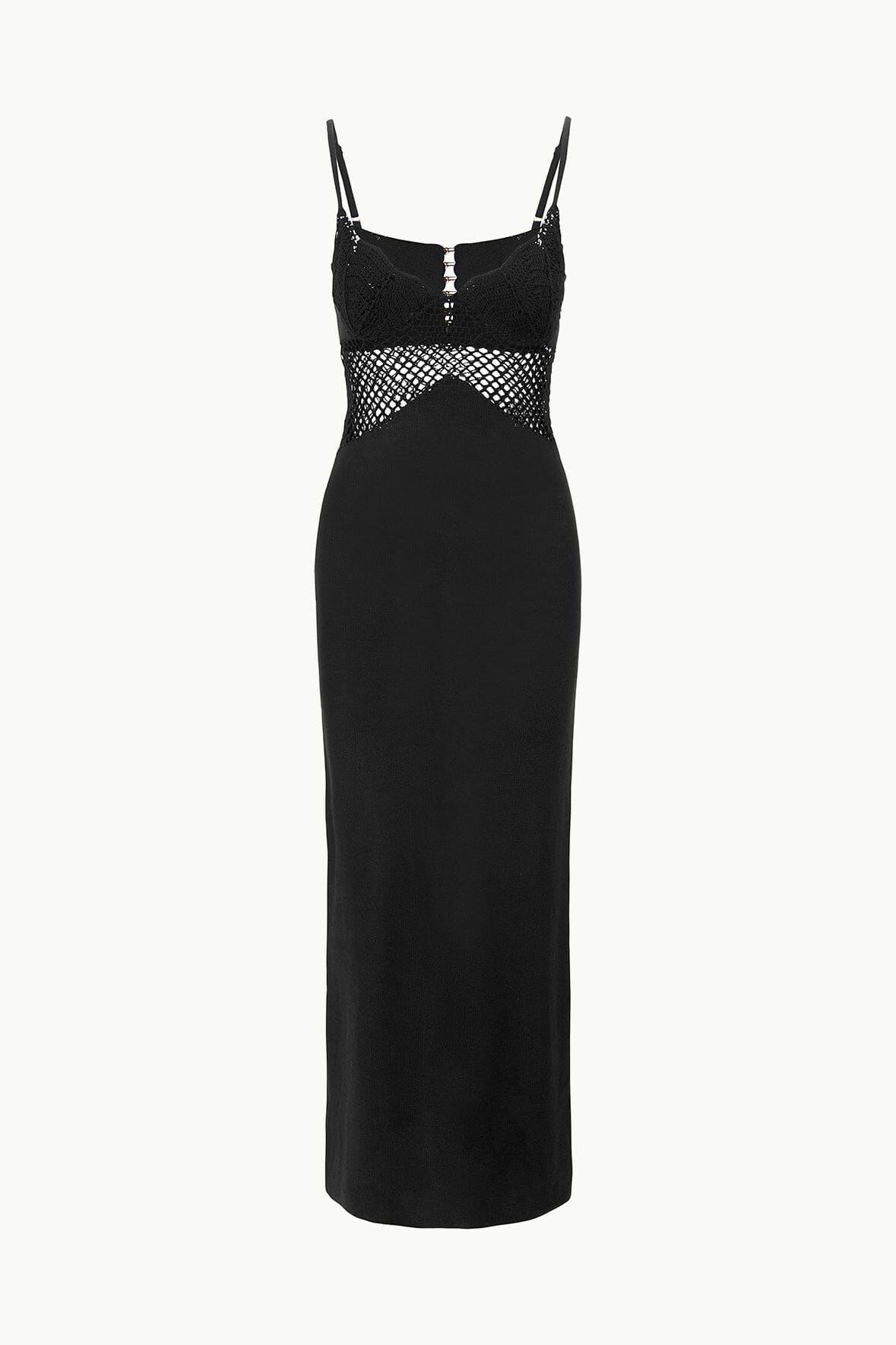 The Tara Dress is a sleek, crochet maxi dress with spaghetti straps and sheer crochet panels. The dress features a fitted bodice and skirt, with shell cup detailing at the bust. MORE DETAILS - Crochet: 100% Cotton; Knitting: 54% Viscose, 43% Linen, 3% Nylon - Model is 5'10 and wearing a size S - Dry Clean Only
