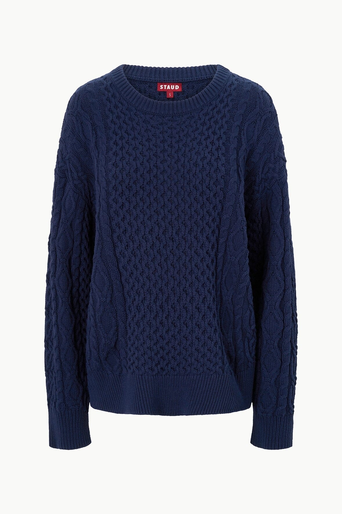 The Tracy Sweater is our new oversized sweater in a cable knit. Perfect for layering over a classic poplin shirt, our newest Staud Sea swimwear, or wearing on its own. MORE DETAILS - 60% Cotton, 40% Acrylic - Model is 5'10 and wearing a size S - Dry Clean Only