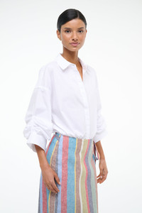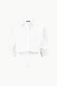 A cotton poplin shirt bodysuit, the Traverse takes the guesswork out of styling an oversized shirt by offering a fixed rolled cuff and adjustable elastic bottom. MORE DETAILS - 98% Cotton, 2% Spandex - Model is 5'10 and wearing a size S - Dry Clean Only
