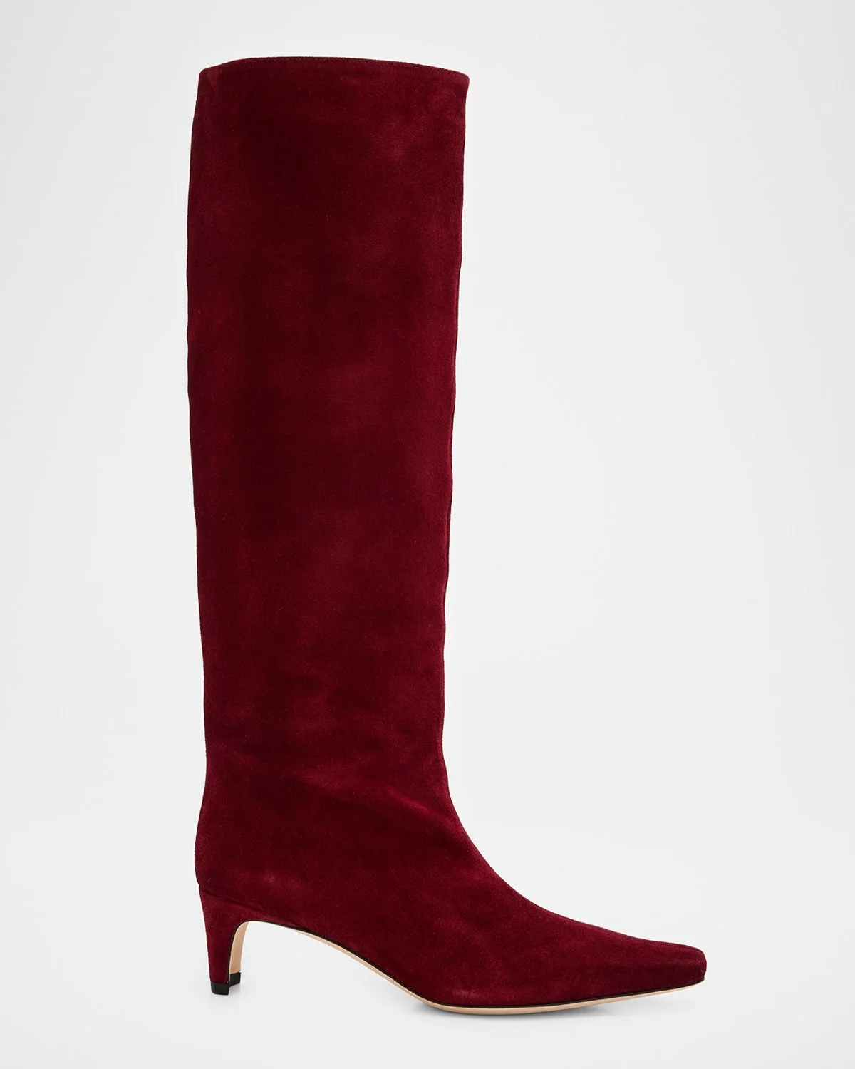 STAUD kneehigh boots in supple lambskin suede 2.3" covered heel Tapered square toe Pullon style Leather lining and sole Made in Portugal