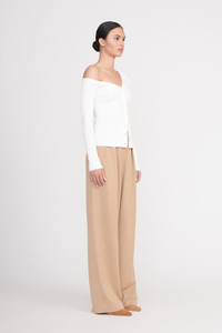 The Craftsman Sweater is our chic update to a classic fitted cardigan. This style is an off-one-shoulder button up cardigan. MORE DETAILS - y1: 65% viscose 35% nylon - Model is 5'10" and wearing a size Small - Dry Clean Only