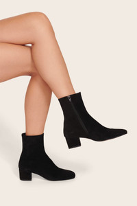The Aimee is a round-toe suede ankle bootie featuring a block heel and side zipper. MORE DETAILS - Suede Short Boot - Fits true to size - Upper: 100% Cow Leather; Sole: 75% Cow Leather, 25% ABS - Heel Height: 50mm, Shaft Height: 6.75", Calf Opening: 10.5"