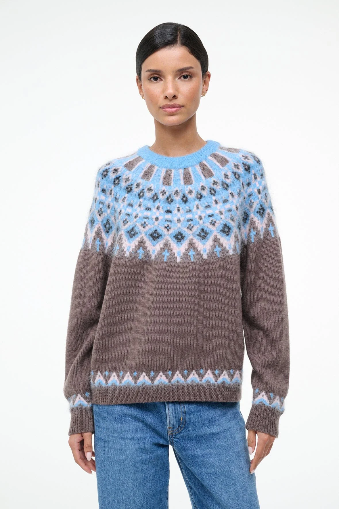 A cozy crewneck pullover, the Zane Sweater features a contrasting fairisle jacquard pattern and is made from a woll blend material. MORE DETAILS - Yarn Blend 1: 60% Wool, 40% Nylon, Yarn Blend 2: 36% Nylon, 30% Mohair, 27% Acrylic, 7% Wool - Model is 5'10 and wearing a size S - Dry Clean Only