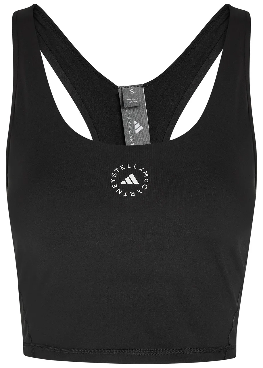 Info & Care adidas X Stella McCartney stretch-jersey;top Scoop-neck, logo print, removable padded cups, racerback, elasticated trims, partially lined Slips on 73% recycled polyester, 23% elastane; lining: 88% recycled polyester, 12% spandex; Machine wash Coordinating items available Size & Fit Length shoulder to hem: 16.5 inches/ 42cm Midweight Close fit, cropped Model is 5'9"/ 175cm and wears a size small