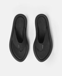 The Air Slide is our first style created with recycled manufacturing waste sourced directly from the factories it is made in. In fact, nearly every component of the progressive flip-flop has recycled content. Its exaggerated midsole is made with 50% recycled phylon (manufacturing waste) – a step in a more circular, zero-waste direction. - Colour: Black - Flip-flops - Exaggerated outer sole - Tonal webbing straps, Stella McCartney logo - Made in: China - Care: Spot clean only with soft damp cloth - Composition: Upper 100% Recycled Polyester, Lining 100%, Outsole 100% Rubber - 30 mm platform - Fits true to size - All of our shoes and accessories are made from non-leather materials as part of our cruelty-free ethos.