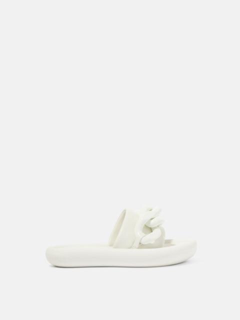 Taking a step towards circularity, our Air Slides are on a puffy sole crafted from industrial waste materials sourced from the factory they are made in. This season, they return as a vegan Alter Mat pool slide with a micro-injection logo detail. - Colour: White - Slide sandals - Puffy-effect Alter Mat - Exaggerated outsole - Tone-on-tone super chunky chain - Made in China Product Care & Fit Advice - Care: Spot clean only with soft damp cloth - Composition: Upper: 60% polyurethane, 40% polyester; Lining: 60% polyurethane, 40% polyester; Outsole: 100% rubber - 35 mm sole - Fits true to size - Lightweight - All of our shoes and accessories are made from non-leather materials in keeping with our cruelty-free ethos.
