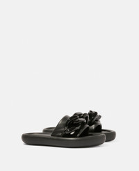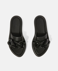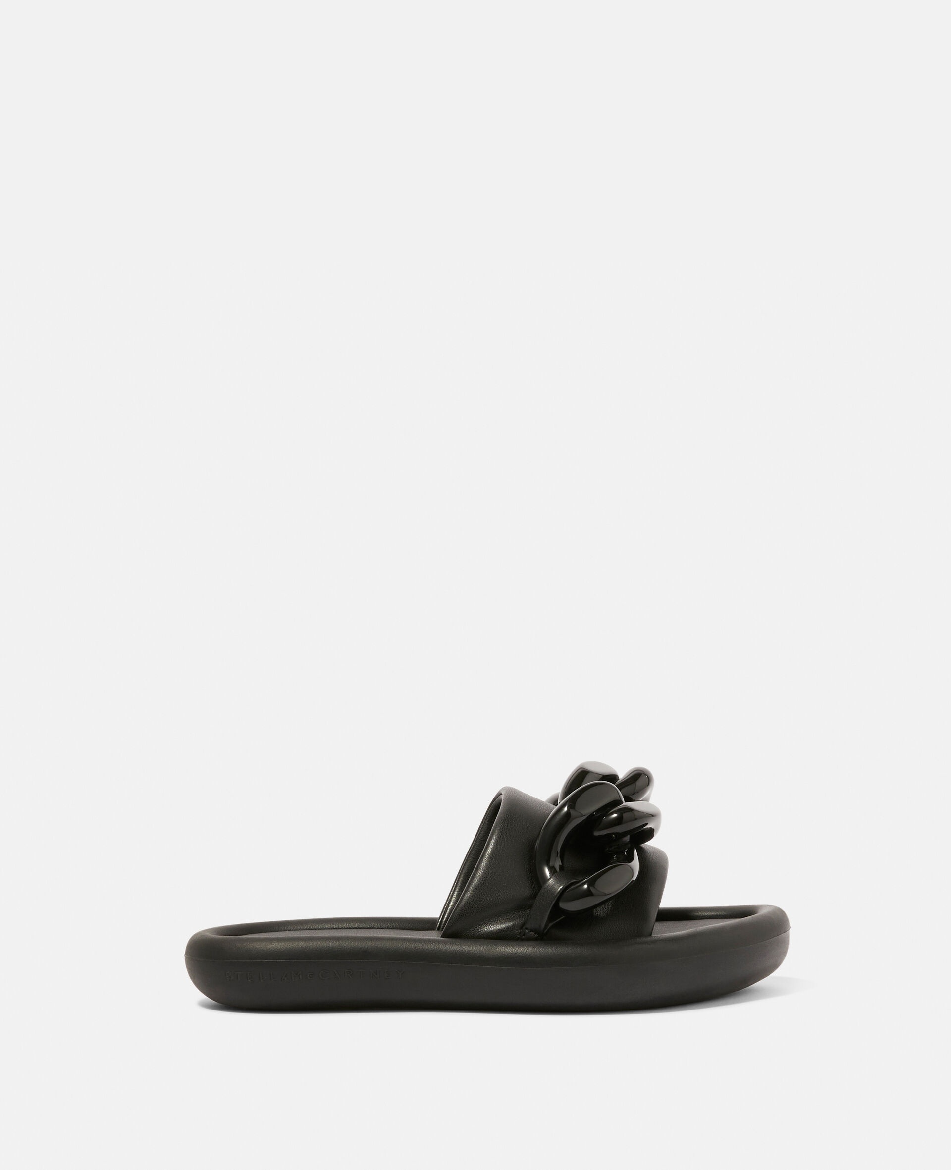 Autumn 2022 is made for an ambitious Stella McCartney woman – desiring to be her best self in all aspects of her life, reflecting her dynamic moods and ageless attitudes. We revisit classic statement pieces that every wardrobe needs, bringing them into the now and elevating them with signature Stella twists - Colour: Black - Slide sandals - Puffy-effect Alter Mat - Exaggerated outsole - Tone-on-tone super chunky chain - Made in: China Product Care & Fit Advice - Care: Spot clean only with soft damp cloth - Composition: Upper: 60% polyurethane, 40% polyester; Lining: 60% polyurethane, 40% polyester; Outsole: 100% rubber - 35 mm sole - Fits true to size - Lightweight - All of our shoes and accessories are made from non-leather materials in keeping with our cruelty-free ethos.