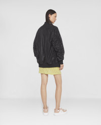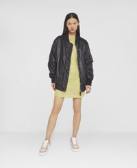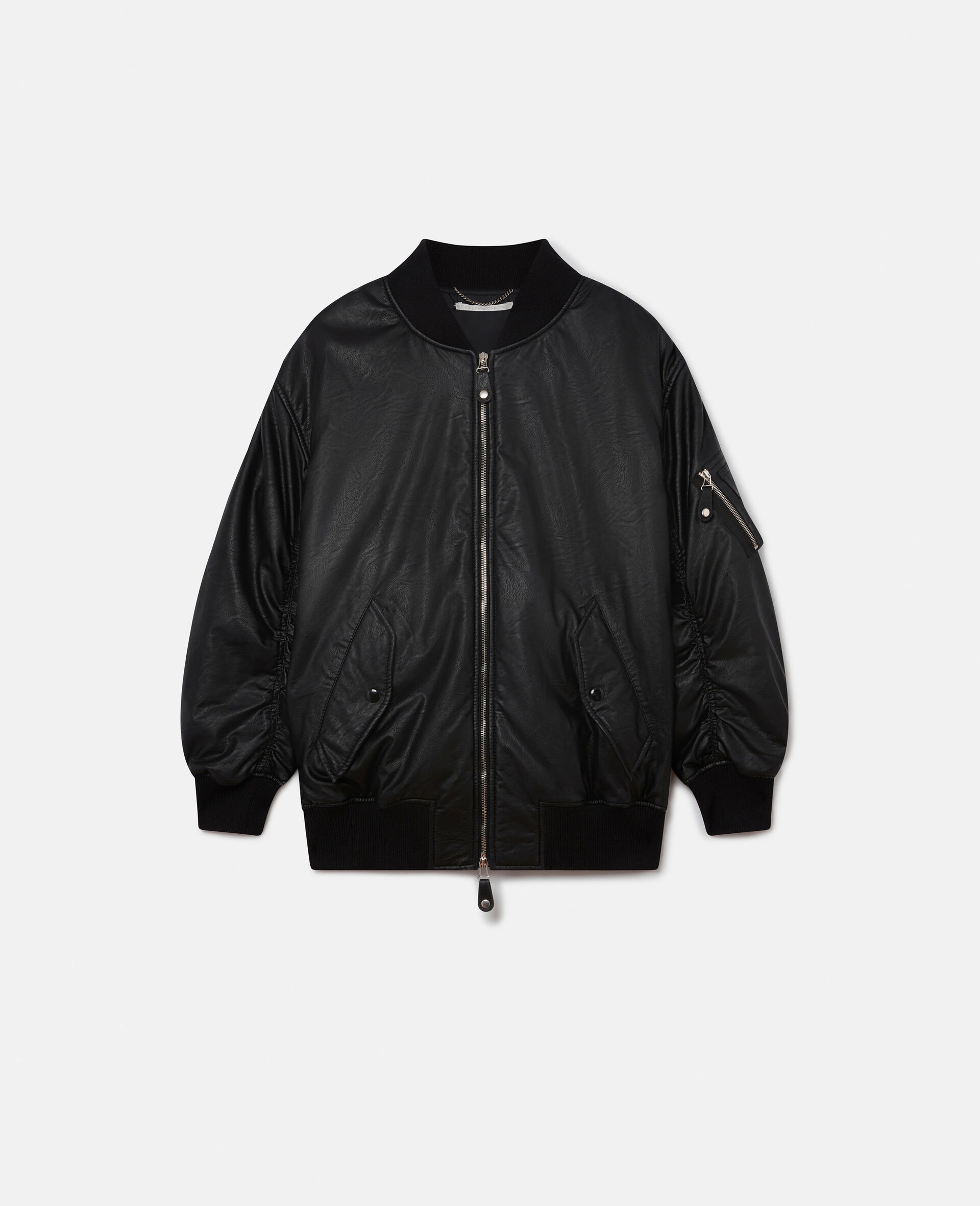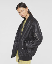 Item 6800473AU9521000 This black Alter Mat bomber jacket is a wardrobe essential. Consciously crafted from a smooth vegan alternative to animal leather, the jacket has contrast sleeves and is cinched at the sleeves and hem. Wear it with dresses or tailoring to play with dichotomies. - Colour: Black - Midnight black - Alter Mat vegan alternative to animal leather - Contrast sleeves - Ribbed bomber collar - Long sleeves - Cinched detail at arm - Ribbed cuffs and hem - Two-way front zip fastening - Two front buttoned pockets - One sleeve patch pocket - Fully lined - Made in Italy Product Care & Fit Advice - Care: Dry clean only - Composition: Main fabric: 65% polyester, 35% polyurethane, Sleeves: 90% wool, 6% polyamide, 4% elastane