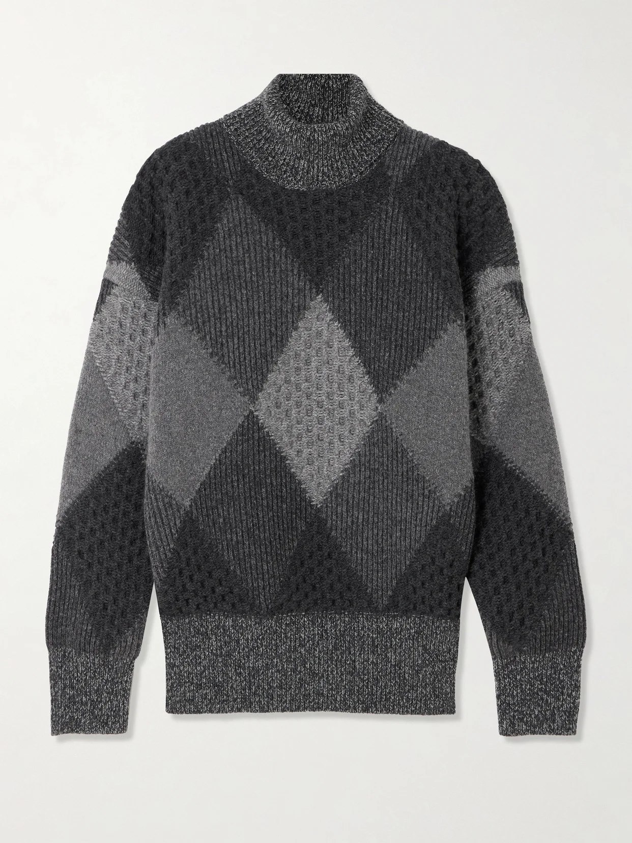 Stella McCartney's sweater is knitted with a classic argyle pattern in shades of gray - each one has a different finish, ranging from smooth to ribbed and honeycomb, enhancing the patchwork design. It's cut for a relaxed fit and has a cozy turtleneck. Lower-Impact Materials. This product is made using at least 50% lower-impact materials or ingredients. Find out more about our NET SUSTAIN criteria here.