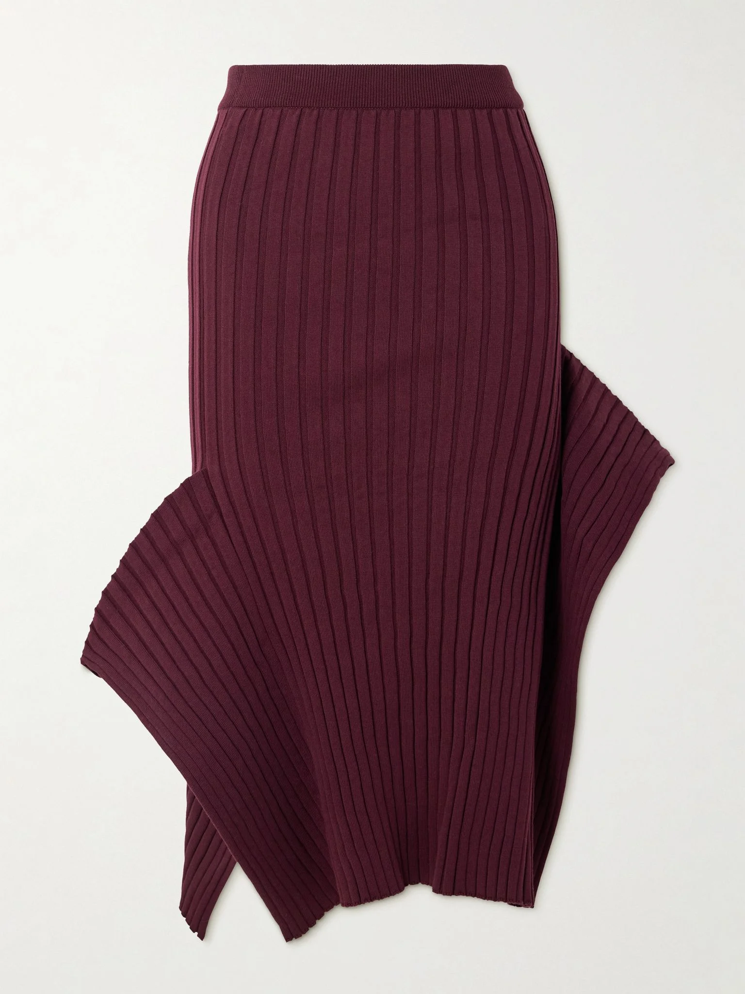 Asymmetric ribbed organic cotton midi skirt Burgundy