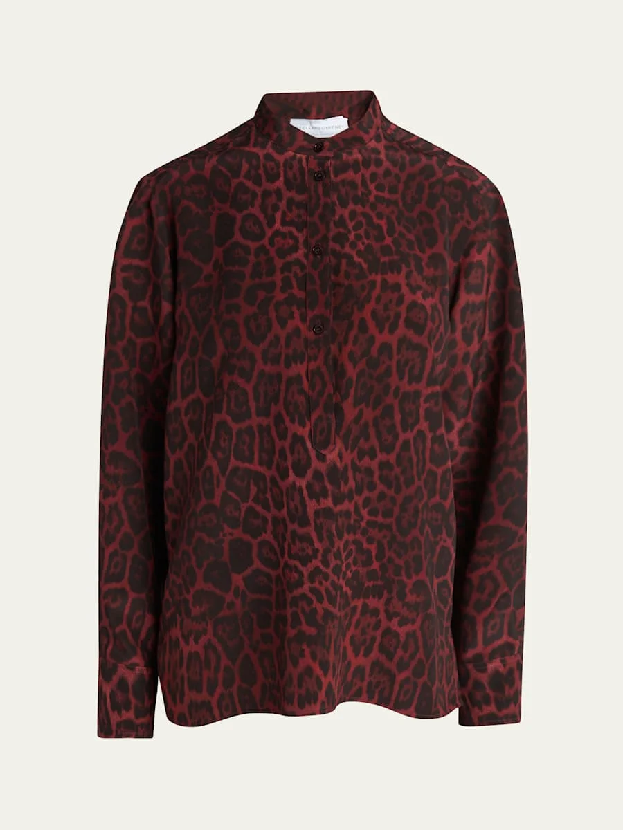 Stella McCartney "Ava" henley blouse in leopard print Band collar; halfbutton placket Long sleeves; button cuffs Back yoke; box pleat Relaxed fit Pullover style Silk Dry clean Made in Romania