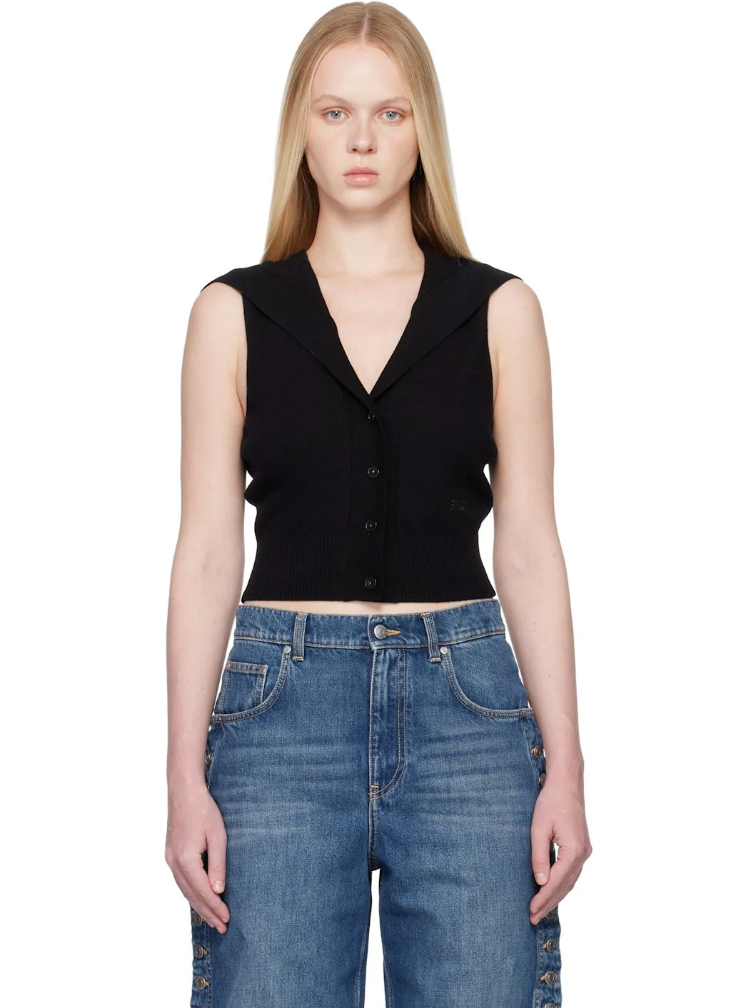 Knit RWS-certified virgin wool sweater vest. · Rib-knit trim at hood, Y-neck, and hem · Button closure · Logo embroidered at front · Cropped hem Made from cruelty-free materials. Supplier color: Black Body: 100% virgin wool. Trim: 89% wool, 10% polyamide, 1% elastane. Made in Italy 252471F097000