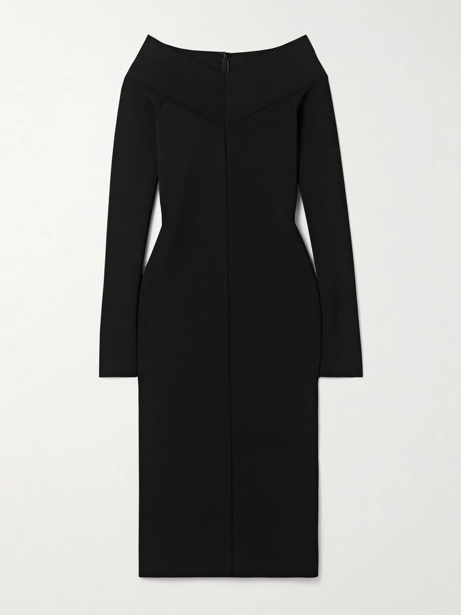 Stella McCartney's dress is knitted with certified viscose. It has an angled Bardot neckline and split at the back hem. Accessorize with pumps and a clutch. Lower-Impact Materials. This product is made using at least 50% lower-impact materials or ingredients. Find out more about our NET SUSTAIN criteria here. Size & Fit - Fits true to size, take your normal size - Intended for a a close fit - Mid-weight knit - Model is 177cm/ 5'10" and is wearing a size Small Details & Care - Black viscose and polyester-blend - Concealed zip fastening along back - 83% viscose, 17% polyester; trim: 63% viscose, 21% polyamide, 15% polyester, 1% elastane - Green dry clean