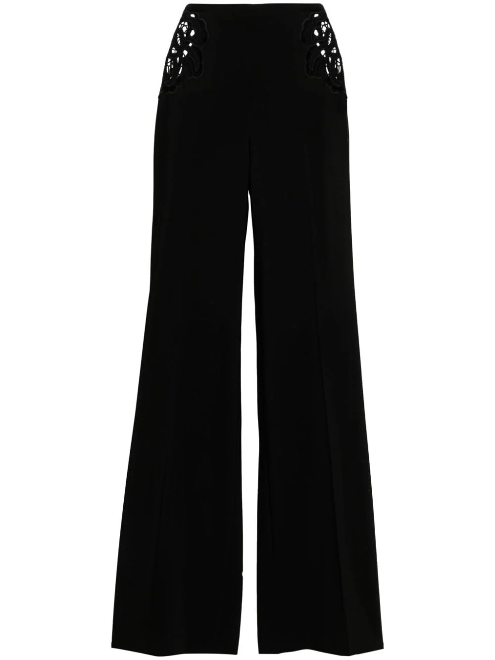 broderie-anglaise tailored trousers Highlights - Black - Stretch-design - Crepe texture - Broderie anglaise panels at the side of the thighs - Pressed crease - Straight leg - Concealed rear zip fastening Imported Composition Viscose 96%, Spandex/Elastane 4% SIZE & FIT Model measurements Height 5 ft 11 in(1.8 m) Bust/Chest 32.67 in(83 cm) Hips 36.22 in(92 cm) Waist 24.4 in(62 cm) FittingInformation Designed with a wide-leg cut, these trousers allow for a close fit at the waist and offer a loose and roomy fit over the leg Made from a midweight stretch fabric, this piece offers elasticity and flexibility when worn This piece fits true to size – take your usual size Washing instructions Dry Clean Only