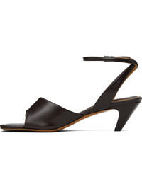 Buffed faux-leather heeled sandals in brown. · Open square toe · Thong-style strap at vamp · Pin-buckle ankle strap · Logo patch at padded footbed · Covered kitten heel with rubber injection · Faux-leather sole · Heel: H2" Made from cruelty-free, non-animal materials. Supplier color: Chocolate brown Upper: synthetic. Sole: synthetic, rubber. Made in Italy 252471F125001