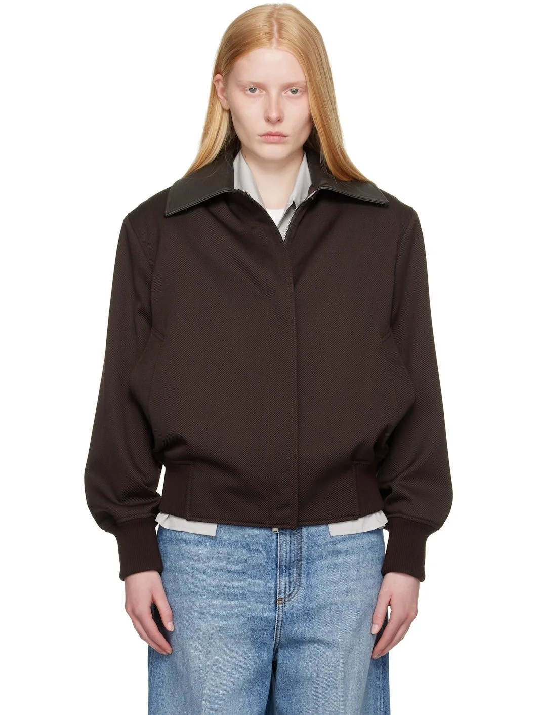 RWS-certified wool cavalry twill jacket. · Faux-leather spread collar · Concealed two-way zip closure · Welt pockets · Rib-knit hem and cuffs · Pleats at back · Full twill lining Made from cruelty-free materials. Supplier color: Raisin Body: 100% wool. Trim 1: 62% polyester, 38% cotton. Trim 2: 100% polyurethane. Trim 3: 90% wool, 6% polyamide, 4% elastane. Lining: 52% viscose, 48% cotton. Made in Italy 252471F063000