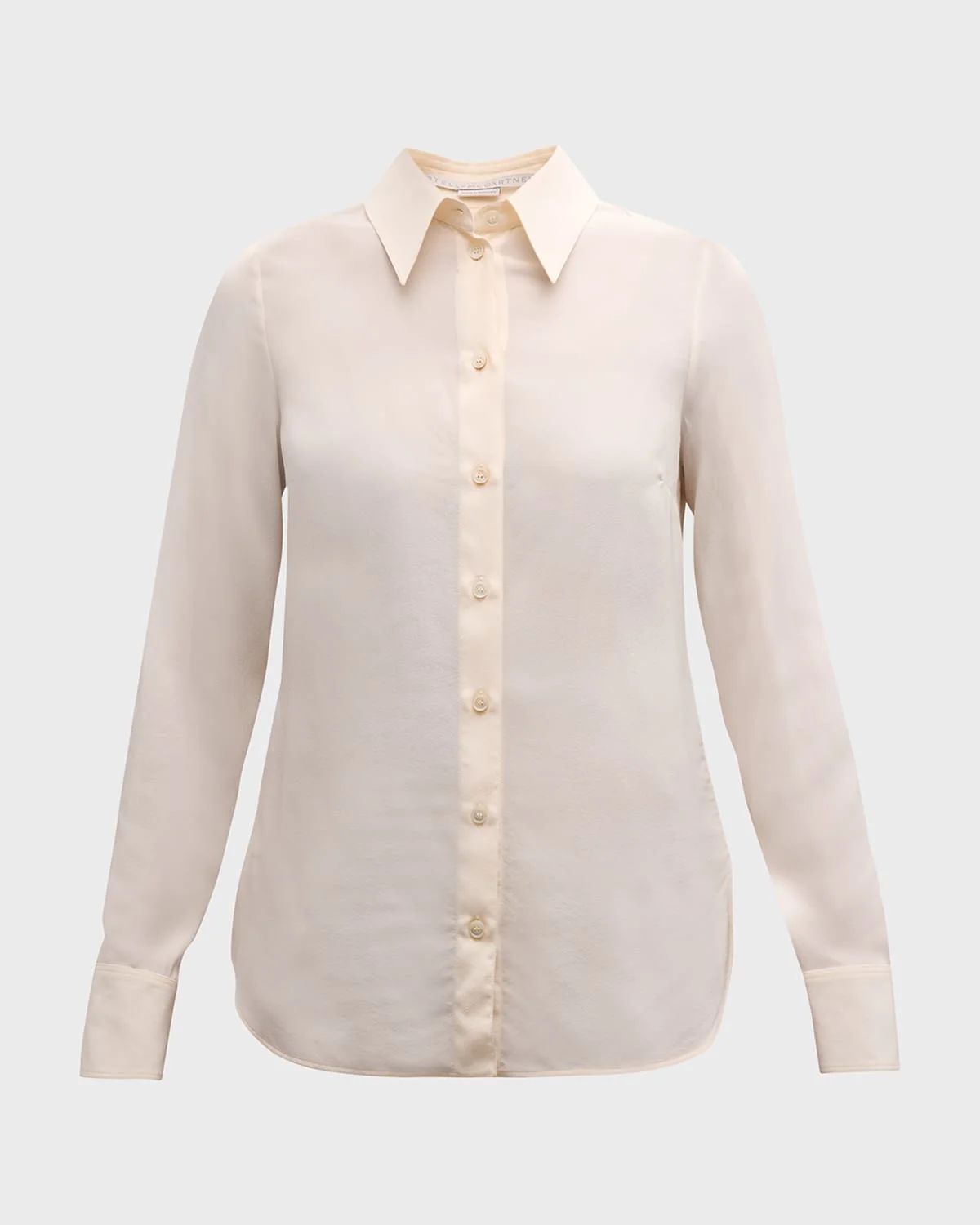 Stella McCartney solid top Point collar; button front Long sleeves; button cuffs Back yoke Relaxed fit Vented sides Silk Made in Romania