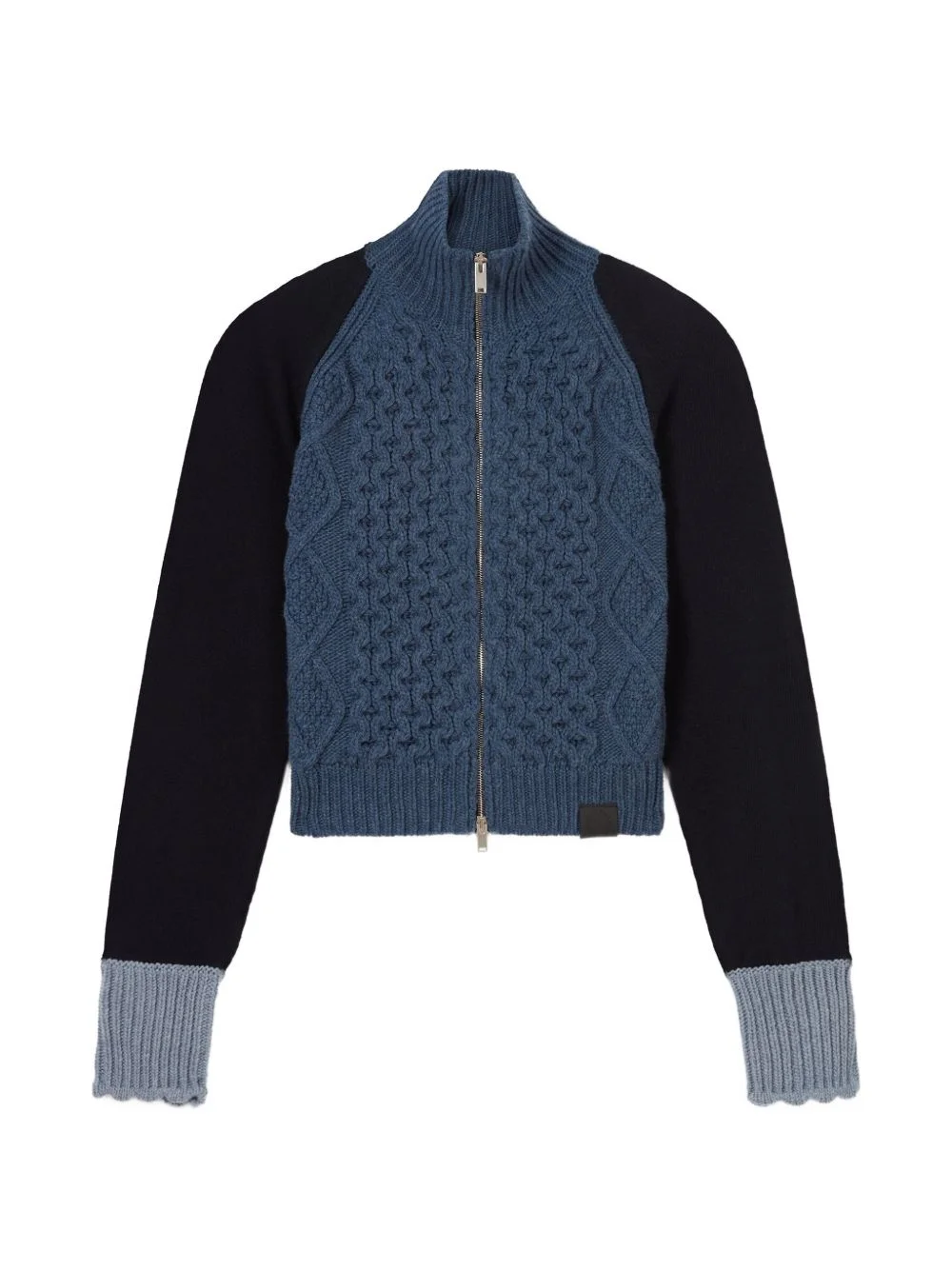 cable-knit cardigan Highlights - Blue - Cable-knit - Ribbed cuffs - High neck - Front zip fastening Imported Composition ZQ Certified Virgin Wool 100% Washing instructions Read Manufacturer Guidelines