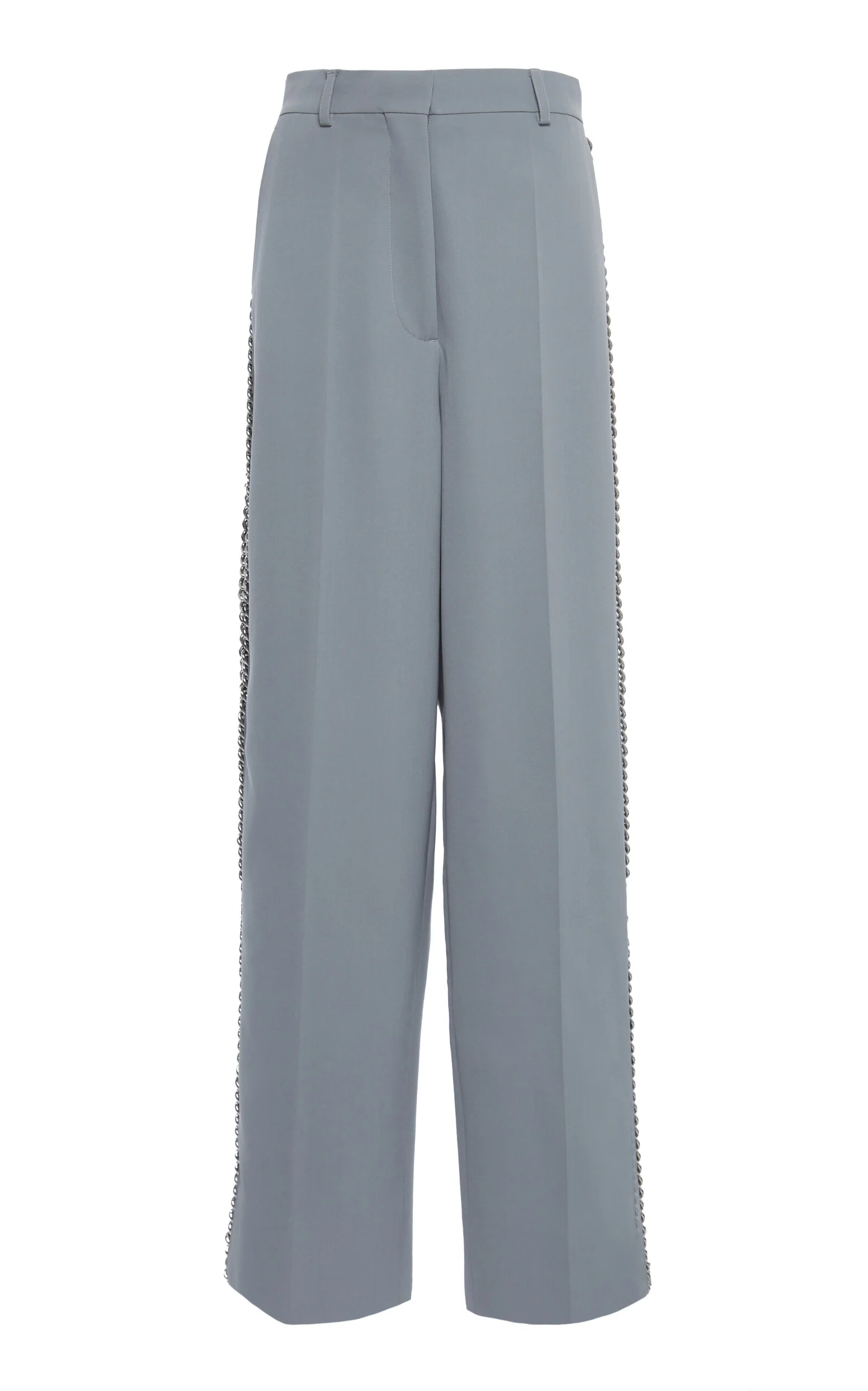 PRODUCT DETAILS - Relaxed fit, mid-rise, wide-leg silhouette, side pockets, chain-embellished side stripe details - Concealed hook and zip fastening along front - Unlined - Composition: 97% Wool, 3% Elastane - Color: light blue - Dry clean - Resort '25