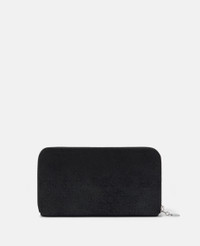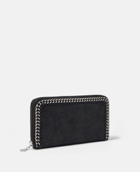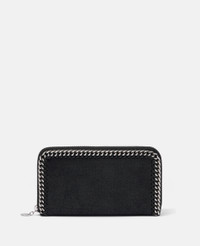Item 434750W91321000U Responsibly made from our matte vegan Shaggy Deer fabric with a semi-gloss grain finish, the Falabella zip continental wallet keeps cash and cards in order. The zip purse has eight card slots and a coin pocket that divides the wallet into two main compartments. - Colour: Black - Midnight black - Matte vegan Shaggy Deer fabric with semi-gloss grain - Signature ruthenium recycled brass and aluminium diamond-cut chain - Waxed GOTS-certified organic cotton lacing - Two main compartments - Zip coin pocket - Eight card slots - Zip-around fastening - Engraved ruthenium zamac logo medallion charm - Fully lined with recycled materials - Made in Italy Product Care & Fit Advice - Care: Use a soft damp cloth with a small amount of demineralised water (likewise for ironing) and apply to all the material. Leave the bag to dry. Avoid scrubbing to prevent damaging the surface of the bag. As this accessory is made from very delicate fabric, we recommend handling with care and avoiding contact with any sharp objects, jewellery, or rough surfaces. When not in use, always store the item in its protective bag. - Composition: Main fabric: 55% polyester, 45% GRS-certified Newlife™ post-consumer recycled polyester, Trims: 70% solventless polyurethane, 30% post-consumer recycled polyester, Lacing: 100% GOTS-certified organic cotton with corn starch wax coating, Chain: 100% aluminium, Medallion: 100% zamac, Magnet: 100% stainless steel, Lining: GRS-certified post-consumer recycled polyester - Size: 18.5 x 10 x 2.5cm - Weighs approximately 0.265kg - All of our shoes and accessories are made from non-leather materials in keeping with our cruelty-free ethos.