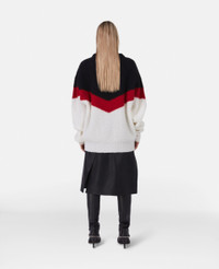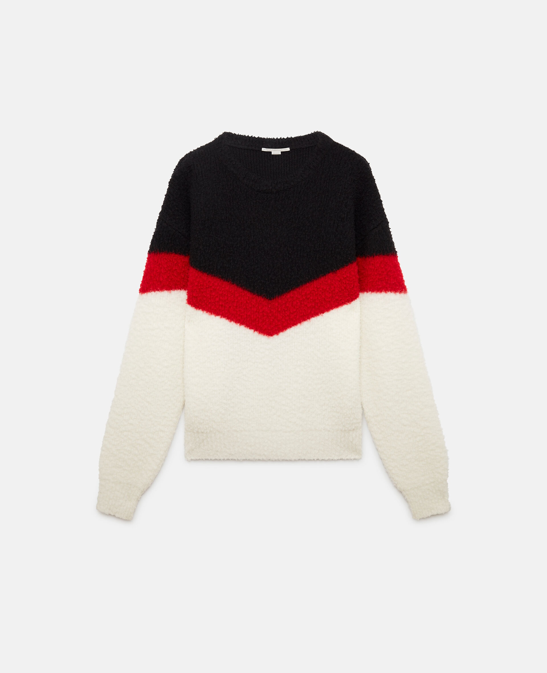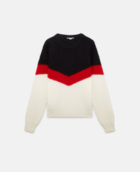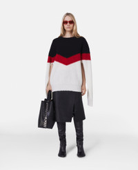 This cape jumper is designed to be versatile, effortlessly slipping into the Stella woman's wardrobe. Its chevron stripe design is punctuated with a lipstick red accent. - Colour: Multicolour - Black, lipstick red and snow white - RWS wool-blend fluffy knit - Tri-colour chevron stripe - Round neck - Long sleeves with two slits underneath armholes - Made in Italy Product Care & Fit Advice - Care: Dry clean only - Composition: 90% wool, 10% polyamide - Fits true to size - Designed for a regular fit - Mid-weight, semi-stretch fabric - This item has two slits underneath the armholes and can be worn as a classic jumper or as a cape.