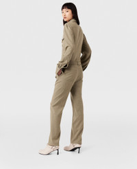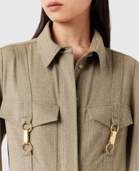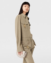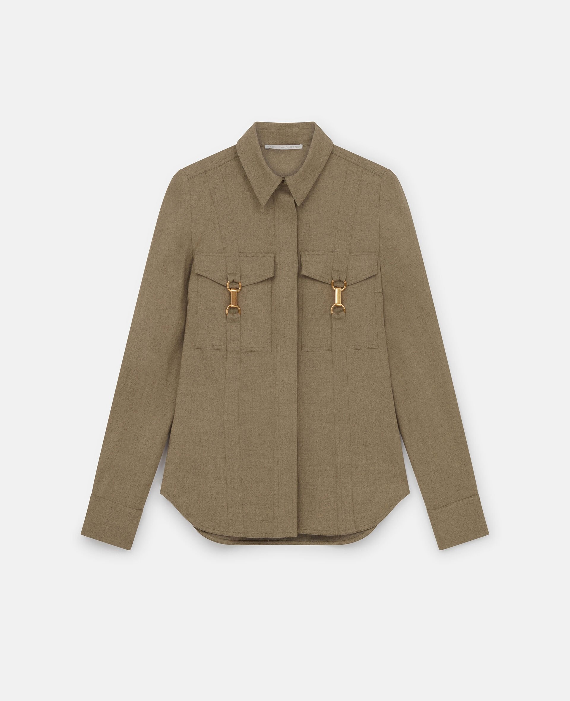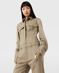 Item 6201203CU7032807 Elevateds hardware details run through Stella McCartney’s Fall 2024 collection. This shirt, tailored from soft RWS-certified wool, loosely outlines the torso before panning out into pleated, straight legs that finish at floor length hems. Detailed with gold clasps stitched on two flap pockets for a utilitarian fashion touch. - Color: Beige - Light moss beige - Classic collar - Long sleeves - Buttoned cuffs - Flat paneled details running down chest - Two flap pockets at chest - Gold clasps on each pocket - Concealed button closure - Made in Romania Product Care & Fit Advice Care: Dry clean only Composition: Main fabric: 100% wool - Size: Fits true to size - Designed for a regular fit - Midweight, non-stretch fabric
