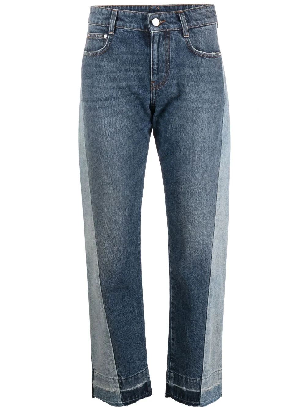 colour-block straight-leg jeans Stella McCartney puts a playful twist on classic straight-leg styles with these jeans. They’re cut from blue denim and punctuated with a light-wash colourblock stripe at each side. Highlights - Indigo blue/light blue - Cotton - Washed denim - Straight leg - Colour-block panelled design - Mid-rise - Belt loops - Front button and zip fastening - Classic five pockets - Cropped leg Made in Italy Composition Lining: Polyester 52%, Cotton 48% Outer: Cotton 100% SIZE & FIT Model measurements Height 5 ft 10 in(1.78 m) Bust/Chest 31.49 in(80 cm) Hips 35.03 in(89 cm) Waist 23.62 in(60 cm) FittingInformation Designed for a straight-leg fit, these jeans allow for a close fit at the waist and an unrestricted and comfortable fit over the leg Sturdy and hard-wearing, this denim piece offers no stretch This piece fits true to size – take your usual size Measurement FRONT RISE 10.62 in(27 cm) HIPS 40.94 in(104 cm) WAIST 32.28 in(82 cm)