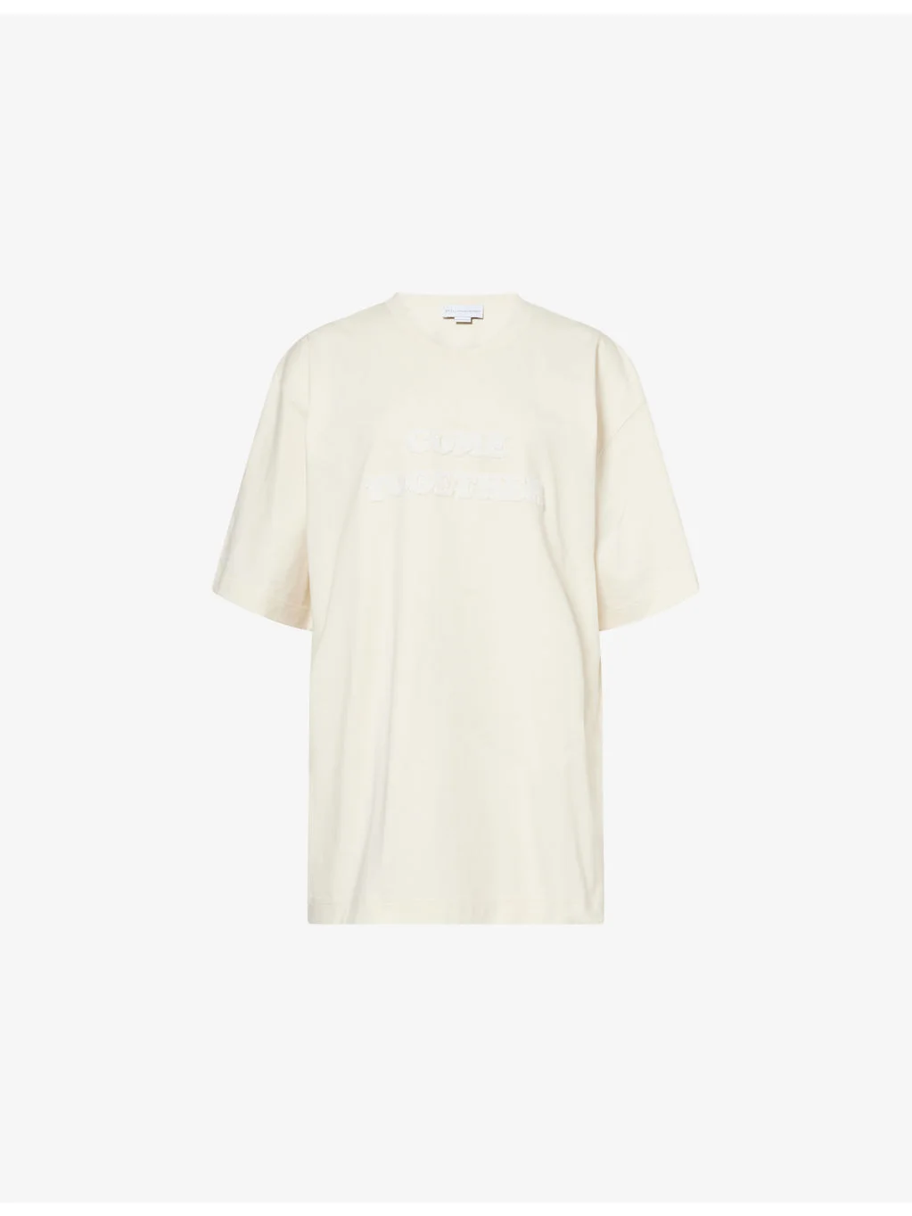 PRODUCT DETAILS - Stella McCartney cotton t-shirt - 94% cotton, 6% elastane - Relaxed oversized fit, round neck, short sleeves, appliqued slogan at front - Machine wash at 30°C - Made in Portugal - True to size - Model is 5ft 10in/1.78m and wears a size small - Lightweight, stretchy Ref: R04617519