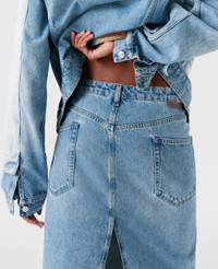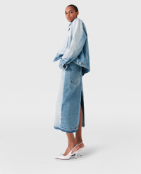 Item 6D03453SQH104545 Crafted from organic cotton, this skirt is cut to a classic midi silhouette accented with panels of contrasting denim and distressed details. It is best paired with the coordinating jacket for an off-duty look. - Color: Tonal denim - Contrasting denim panels - High-rise - Straight cut - Distressed finish - Slit in the front and back - Button and zipper fastening - Two front pockets - Two back pockets - Made in Italy Product Care & Fit Advice Care: Dry clean only Composition: 100% Cotton Fit: Regular fit Sizing: Take your usual size Midweight, non-stretch fabric