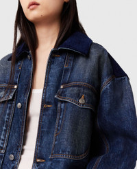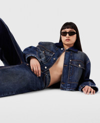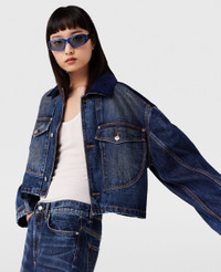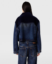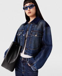 Item 6D02903SPH824480 Crafted from organic cotton, this denim jacket is cut in a boxy, cropped silhouette with exaggerated chest pockets – finished in a deep, dark vintage wash. Accented with a ribbed corduroy collar, it’s best paired with the coordinating jeans and some S-Wave sneakers for an off-duty look. - Color: Blue denim - Dark wash blue denim - Navy corduroy collar - Long sleeved - Navy corduroy paneling - Distressed finish - Contrasting stitching - Concealed zipper fastening - Two large front pockets - Cropped hem - Made in Italy Product Care & Fit Advice Care: Dry clean only Composition: Main fabric: 100% cotton Size: Fits true to size Designed for a regular fit Midweight, non-stretch fabric