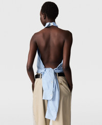 Item 6T0254SMA904008 Spun from organic silk, this slinky top begins with a wrapped halterneck split into two panels. Cascading straight past hips to a split above the waistline, the number is primed for day-to-night appeal. - Color: Blue - Halterneck - Wrapped panel from neckline down - Split above waistline - Zipper fastening - Made in Romania Product Care & Fit Advice - Care: Dry clean only - Composition: 100% Cotton - Fit: Fits all phones alongside small daily essentials. - Size: 18 x 17.5 x 6cm - Handle drop: 7cm - Strap length: 47cm - Weighs approximately: 0.435kg - Model wears a size 40 IT or 8 UK