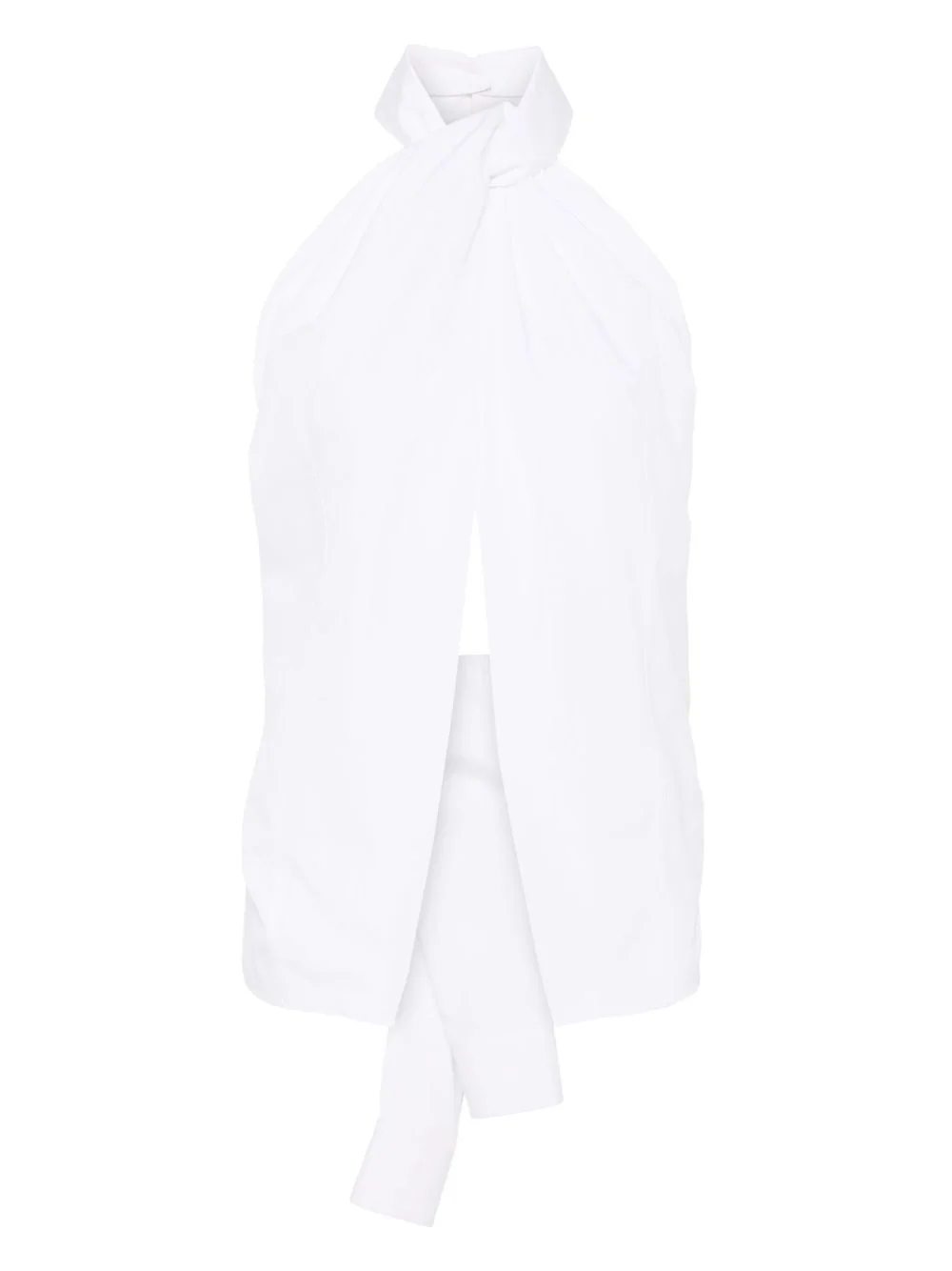 halterneck sleeveless top Highlights - White - Single rear button fastening - Rear tie fastening - Ruched detailing - Asymmetric hem Imported Composition Cotton 100% SIZE & FIT Model measurements Height 5 ft 11 in(1.8 m) Bust/Chest 31.49 in(80 cm) Hips 35.82 in(91 cm) Waist 24.8 in(63 cm) FittingInformation Designed for a slim fit that sits just away from the body offering a close yet comfortable fit Made from a midweight non-stretch fabric Washing instructions Dry Clean Only