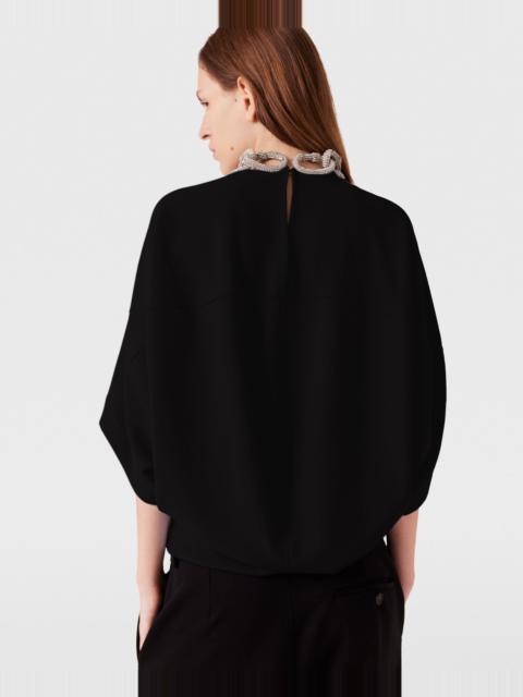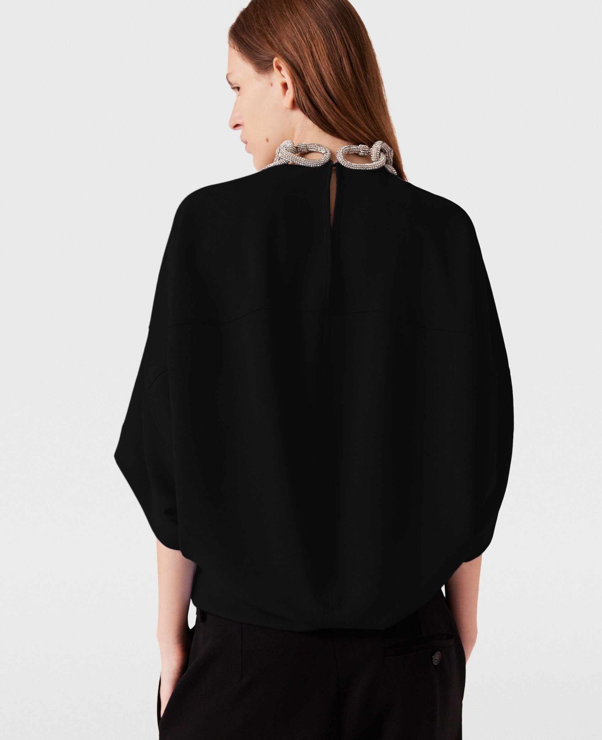 Item 6T0228SNA281000 Inspire evening glamor with this dramatic top from Stella McCartney. Crafted using a luxurious satin innovated from responsibly sourced wood pulp, the short-sleeve blouse is topped with an iconic Falabella collar encrusted with lead-free crystals. - Color: Black - Forest-friendly viscose-blend double satin - Lead-free crystal Falabella chain collar - Crewneck - Short sleeves - Waist-length hem - Made in Italy Product Care & Fit Advice Care: Dry clean only Composition: 51% viscose, 47% acetate Fit: Regular fit Sizing: Take your usual size Lightweight, non-stretch fabric
