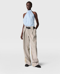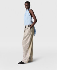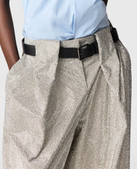 Item 6402683FU1509199 Savile Row tailoring is foundational to every Stella McCartney collection, embodying her signature masculine-yet-feminine perspective. For Summer 2025, these glimmering pants are immaculately constructed from organic cotton embellished with lead-free crystals all-over. They are tailored to a low-rise, straight-leg silhouette with exaggerated belt loops that stream into panels. - Color: Black - All-over rhinestone embellishment - Mid-rise - Exaggerated belt loops - Two pockets - Large panels running down the center of each leg - Low crotch - Button and zipper-fly fastening - Made in Italy Product Care & Fit Advice - Care: Dry clean only - Composition: 100% Cotton - Fit: Loose fit - Sizing:: Take your usual size