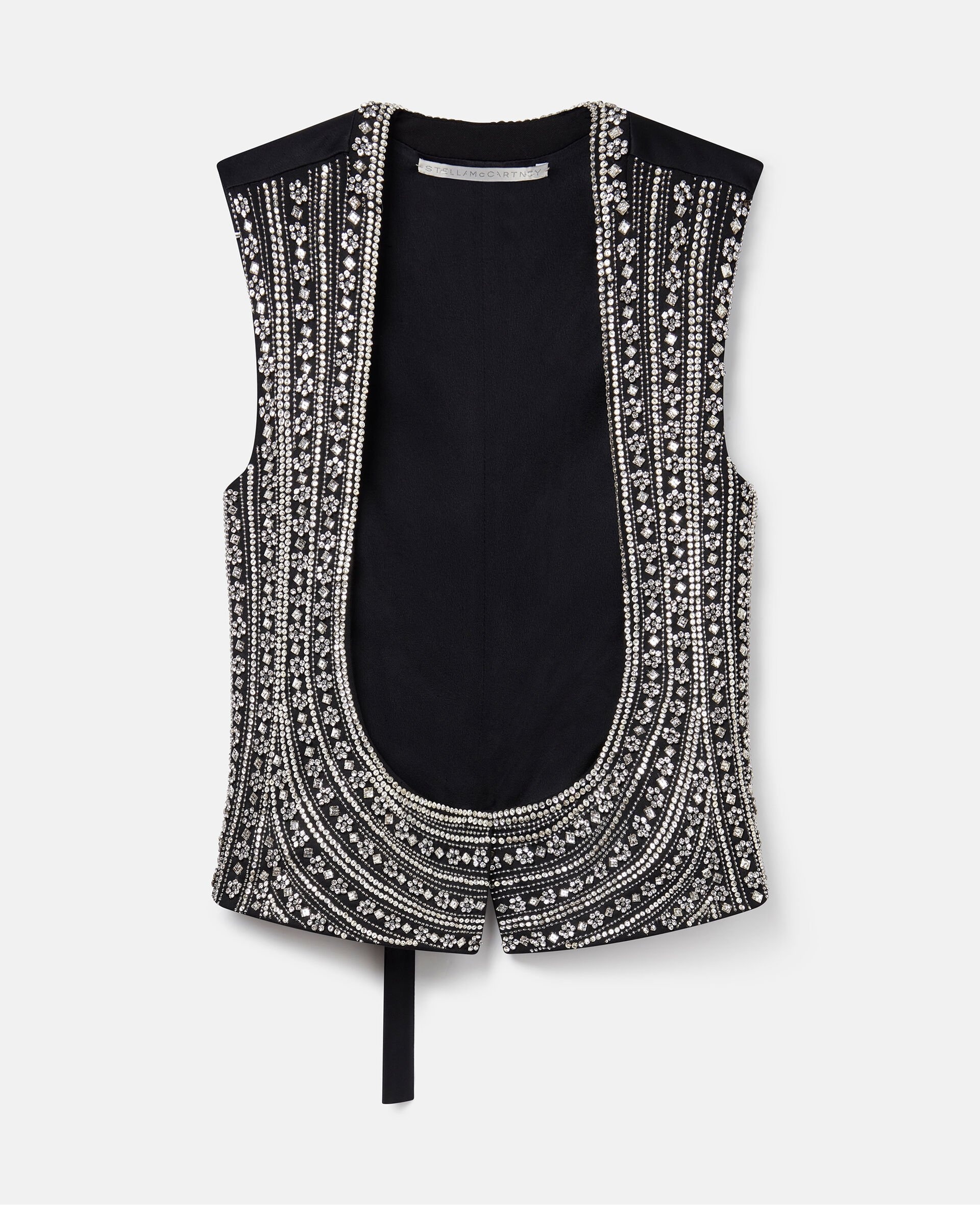 Item 6900123DU6551000 This waistcoat is a fusion of three things Stella McCartney knows and loves most: music, care for our fellow creatures and Savile Row tailoring. Inspired by her father’s on-stage looks, this dazzling piece is expertly constructed from fully traceable RWS-certified wool and embellished with consciously sourced brass and glass crystal beads. Style yours over a ruffled shirt for an ensemble straight off our Summer 2024 runway. - Colour: Silver - Metallic silver - All-over glass and crystal bead-embellishment - Tuxedo-inspired outline - Waist-length - Slips on Product Care & Fit Advice Dry clean only Composition: Main fabric: 100% wool Size: Fits true to size Designed for a regular fit Midweight, non-stretch fabric