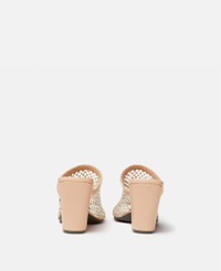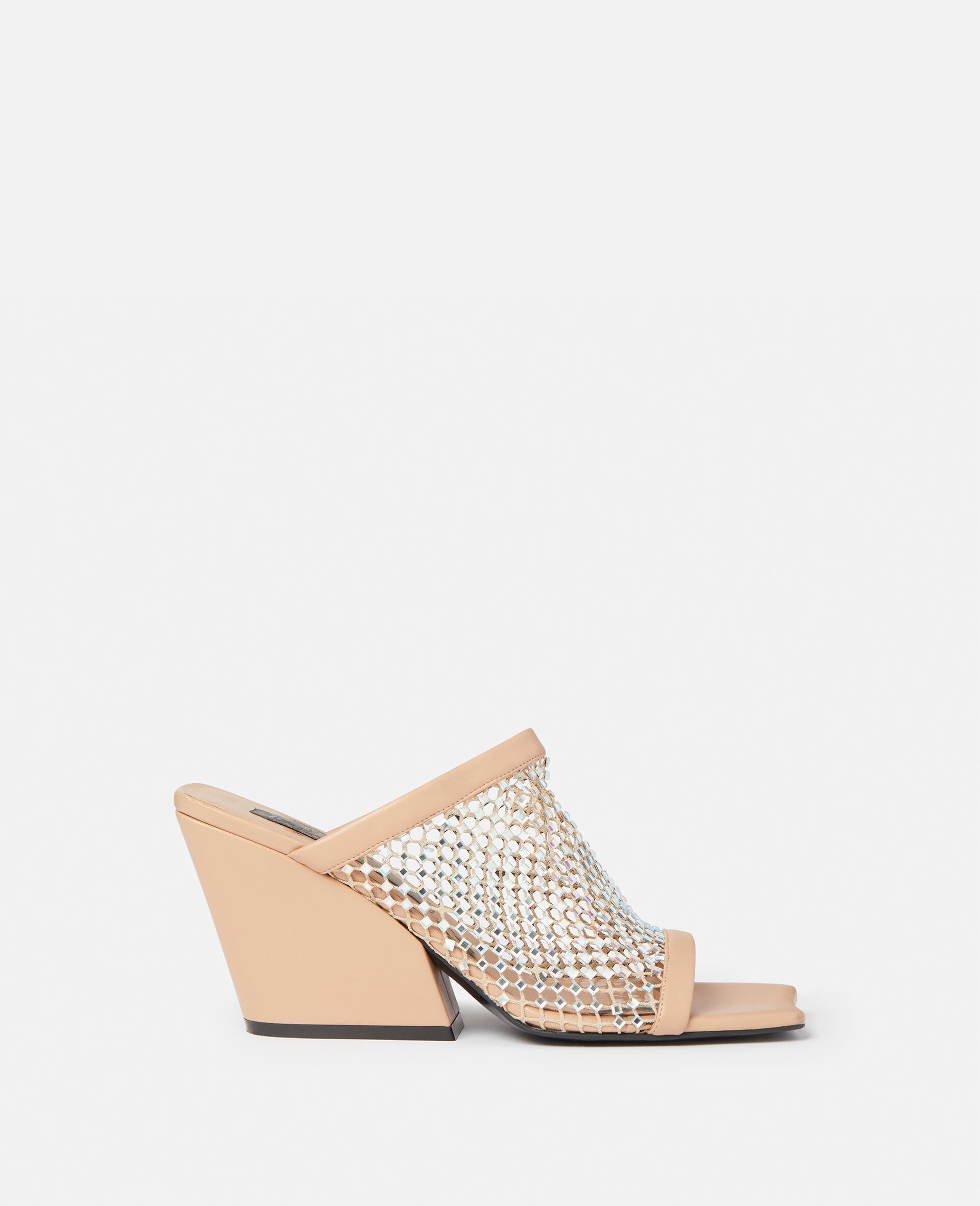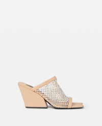 Summer 2022 evokes a sensual femininity, encouraging Stella women to redefine sexiness with an effortless and vibrant wardrobe. It harmonizes billowing shapes with bodycon silhouettes, near-transparent airiness with rich textures, and biophilic cut-outs on psychedelic prints. - Color: Powder - Heeled sandals - Slip-on - Wide crystal mesh strap - Square toe - Chunky angled heel - Made in: Italy - Care: Spot clean only with soft damp cloth - Composition: Upper 11% polyurethane, 4% recycled polyester, 38% polyester, 42% glass, 5% spandex; Lining: 64% polyurethane, 36% viscose; Outsole: 100% vegan thunit Product Care & Fit Advice - 80 mm/3 in. heel - Fits true to size - All of our shoes and accessories are made from non-leather materials as part of our cruelty-free ethos.