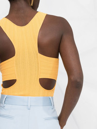 cut-out knit bodysuit Highlights - Light orange - Ribbed knit - Cut-out detailing - Twist detailing - Scoop neck - Sleeveless - Racerback - Stretch-design - Just a reminder that this piece must be tried on over your own garments. Made in Italy Composition Viscose 86%, Polyester 14% SIZE & FIT Model measurements Height 5 ft 10 in(1.77 m) Bust/Chest 32.28 in(82 cm) Hips 35.03 in(89 cm) Waist 25.19 in(64 cm) FittingInformation This piece fits true to size. We recommend you get your regular size Cut for a close fit Made with a mid-weight fabric Measurement LENGTH 22 in(55.9 cm) WAIST 15.98 in(40.6 cm) BUST 22 in(55.9 cm) Washing instructions Dry Clean Only