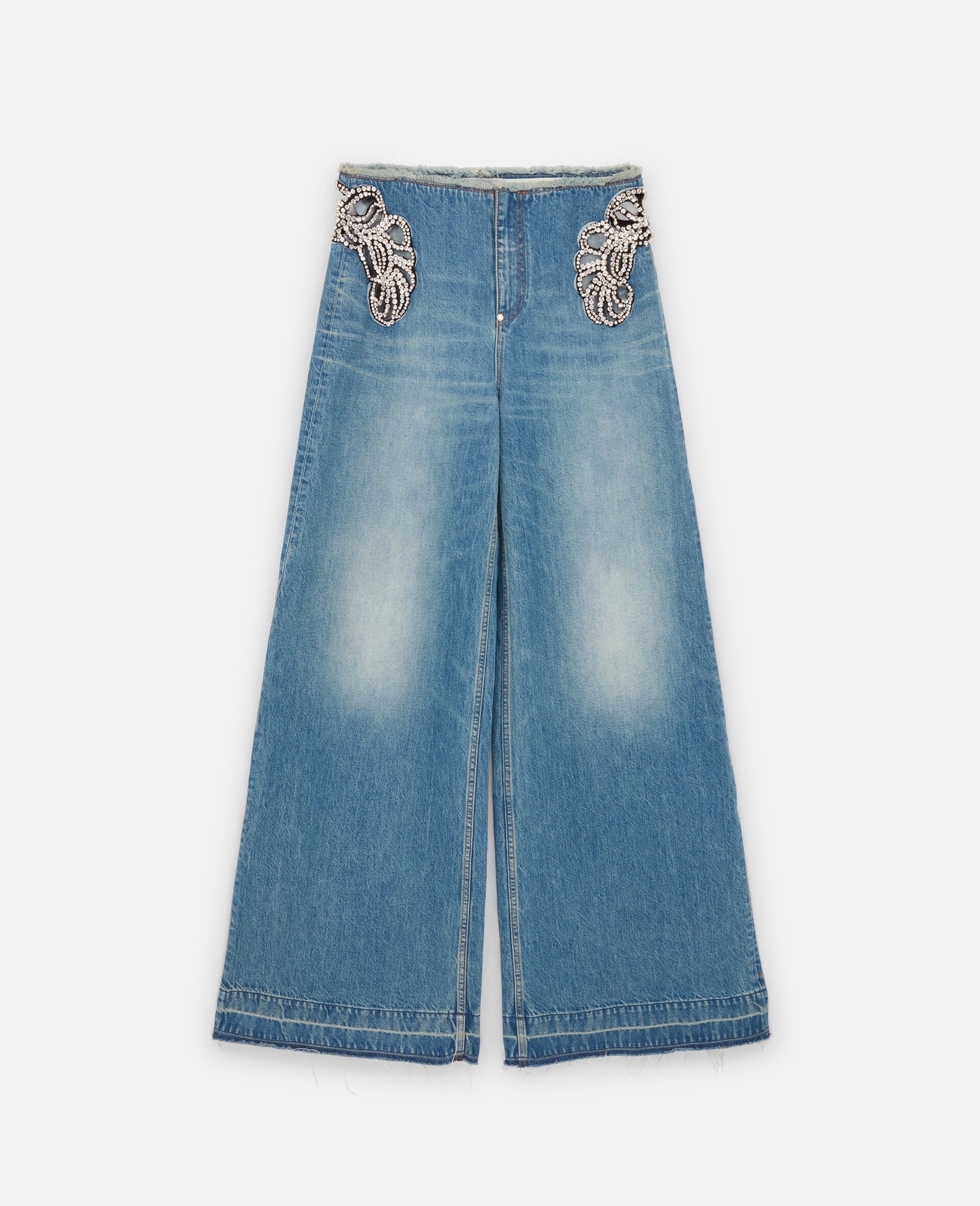 Item 6D03023SPH844052 The iconic Stella cut-out pants from our Summer 2024 runway collection return in these vintage wash jeans from Stella McCartney. Spotlighting a 2000s nostalgia, the organic cotton jeans have diamante Stella swirls at the hips with a frayed waistband and dramatically slouchy, wide legs. - Color: Blue denim - Faded wash blue denim - Mid rise - Belt loops - Wide leg - Two front pockets, two back pockets - Crystal-embellished cut outs at hips - Distressed trims - Concealed zipper fastening - Made in Portugal Product Care & Fit Advice Care: Dry clean only Composition: Main fabric: 100% cotton Size: Fits true to size Designed for a regular fit Midweight, non-stretch fabric