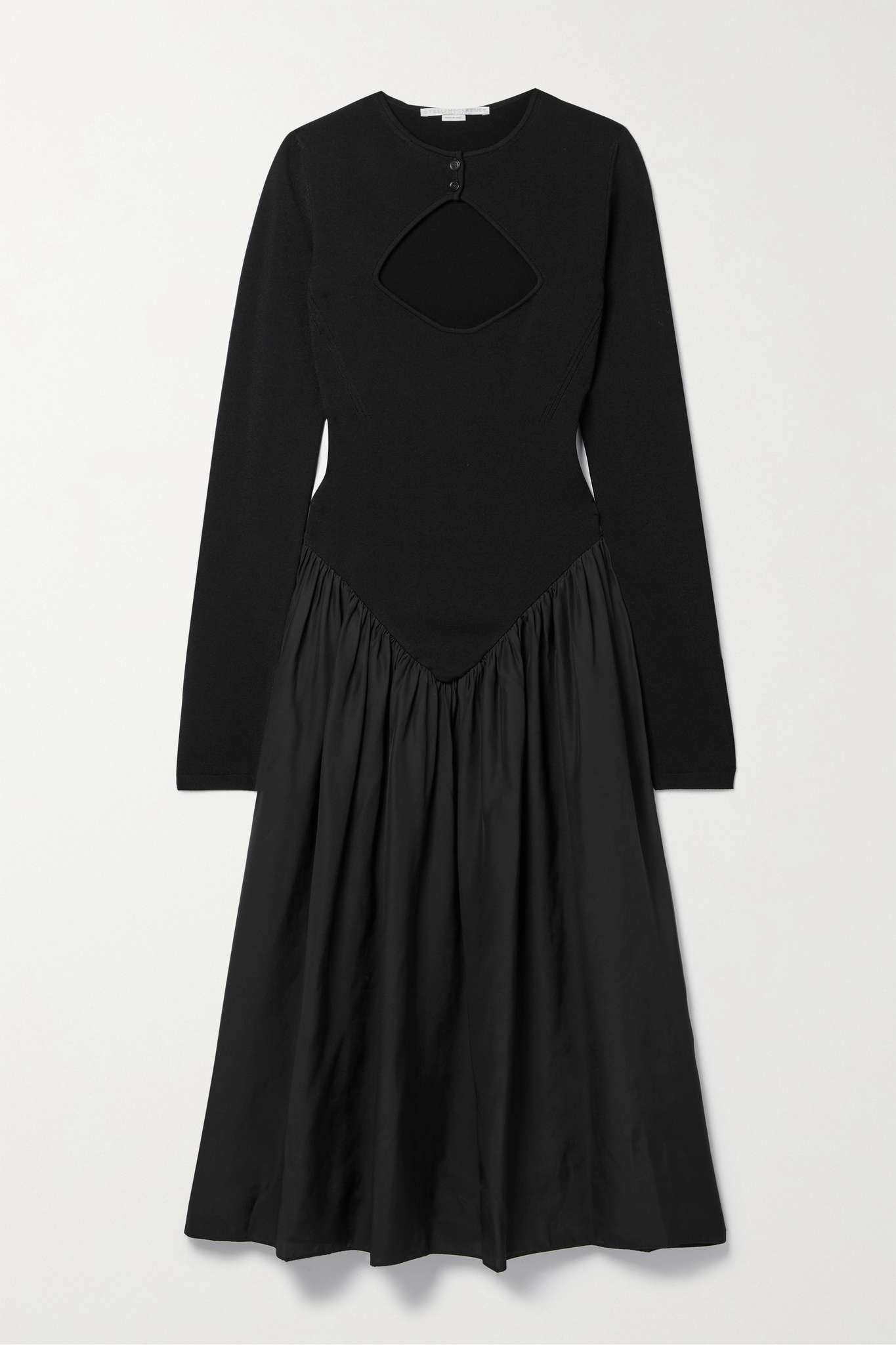EDITORS'NOTES Stella McCartney's dress is designed with a smooth stretch-knit bodice defined by a bold cutout. It has a lustrous silk-satin skirt that's gathered along the waist and falls to a midi length. Style yours with pumps and a clutch for parties. SIZE & FIT - Fits true to size, take your normal size - Designed to be fitted at the bust and waist, slightly loose at the hip - Lightweight, non-stretchy fabric - Model is 175cm/ 5'9" and is wearing an IT 40 DETAILS & CARE - Black stretch-knit and silk-satin - Button-fastening keyhole at front - Fabric1: 83% viscose, 17% polyester; fabric2: 100% silk - Hand wash