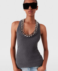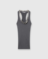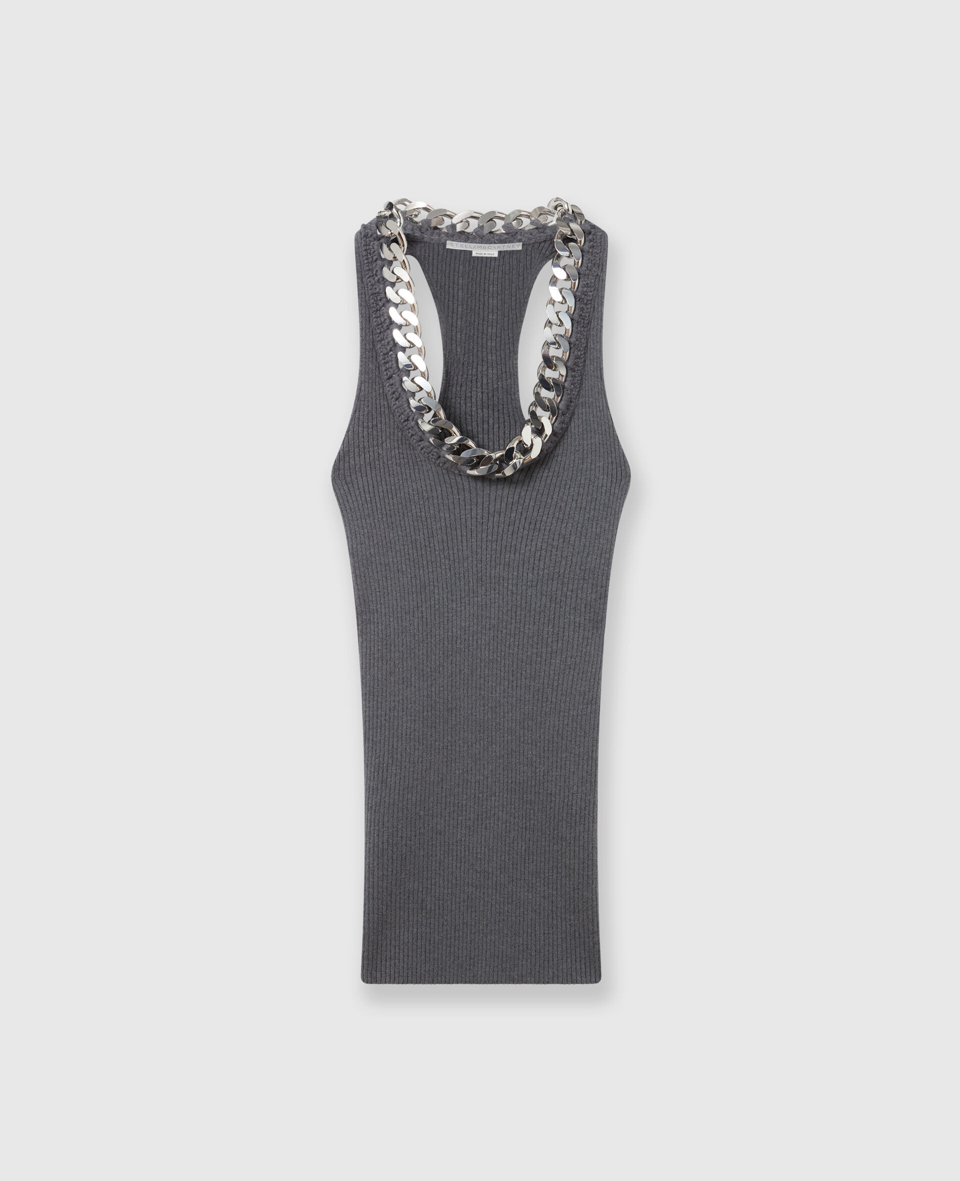 Item 6K09133S25611267 Elevate your wardrobe with this off-duty essential from Spring 2025. Spun from RWS-certified virgin wool, this minimal dress is topped with Stella McCartney’s iconic Frayme chain by the neckline. - Color: Dark gray melange - Scoop neck - Frayme chain at neckline - Ribbed - Sleeveless - Waist-length hem - Slips on - Made in Romania Product Care & Fit Advice Care: Dry clean only Composition: 100% virgin wool Fit: Regular fit Sizing: Take your usual size
