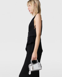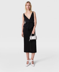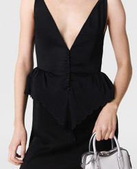 Item 6A05343FU3021000 Inspire day-to-evening glamor with the sensual silhouette of this Stella McCartney dress. Crafted using a luxuriously silky satin innovated from responsibly sourced wood pulp, the gown is topped with a plunging V-neck, tonal buttons and a tiered, scalloped-trim peplum panel at the waist. - Color: Black - V-neck - Sleeveless - Scalloped edge peplum panel at waist - Tonal buttons - Calf-length hem - Zipper fastening - Made in Italy Product Care & Fit Advice - Care: Dry clean only - Composition: 73% viscose, 27% acetate - Fit: Regular fit - Sizing: Take your usual size - Model wears a size 40 IT or 8 UK