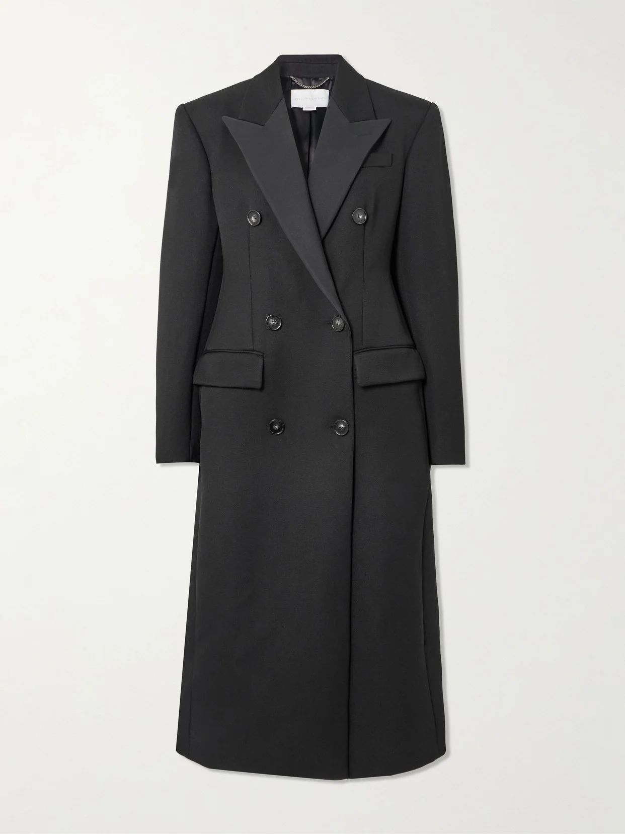 Riffing on classic tuxedo jackets, Stella McCartney's coat is tailored from twill for a sharp, double-breasted profile and finished with satin lapels. It has padded shoulders and a gently sculpted waist, which define the shape.
