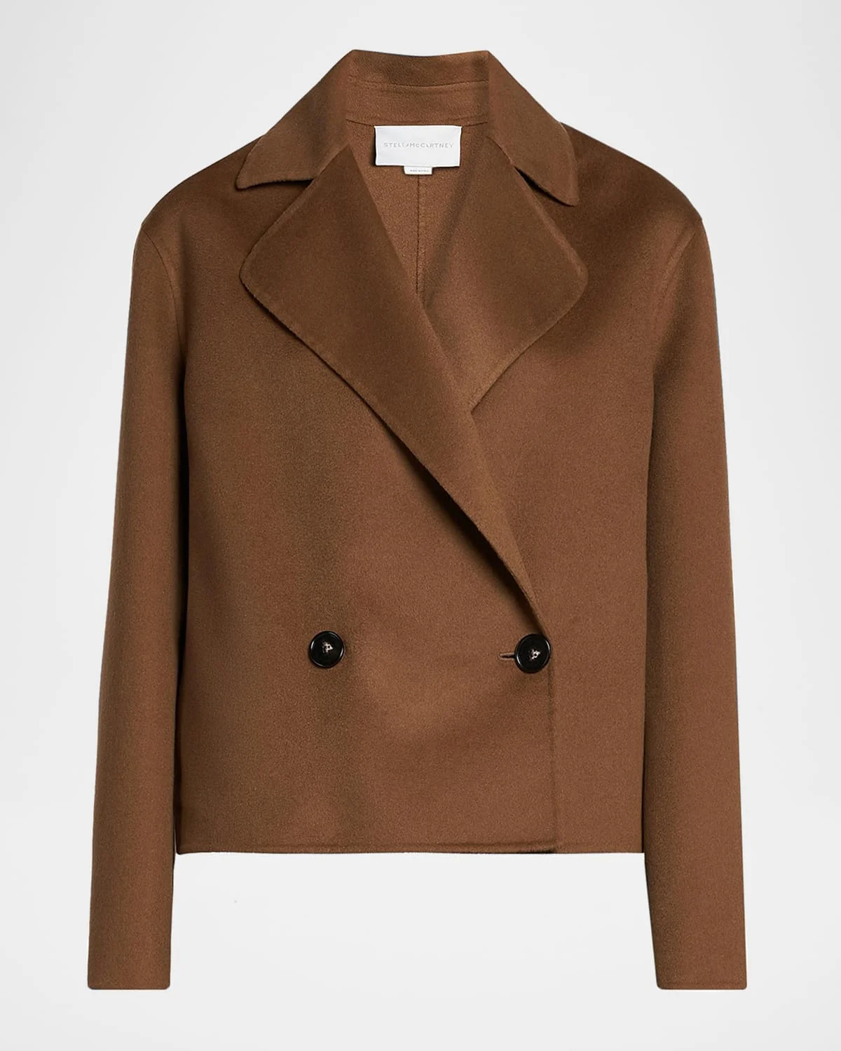 Crafted of luxurious wool, this short peacoat from Stella McCartney is tailored with onseam pockets and a slightly oversized fit. Notch lapels; doublebreasted front Long sleeves Side split pockets Boxy fit Hip length Buttonfront closure Wool Dry clean Imported