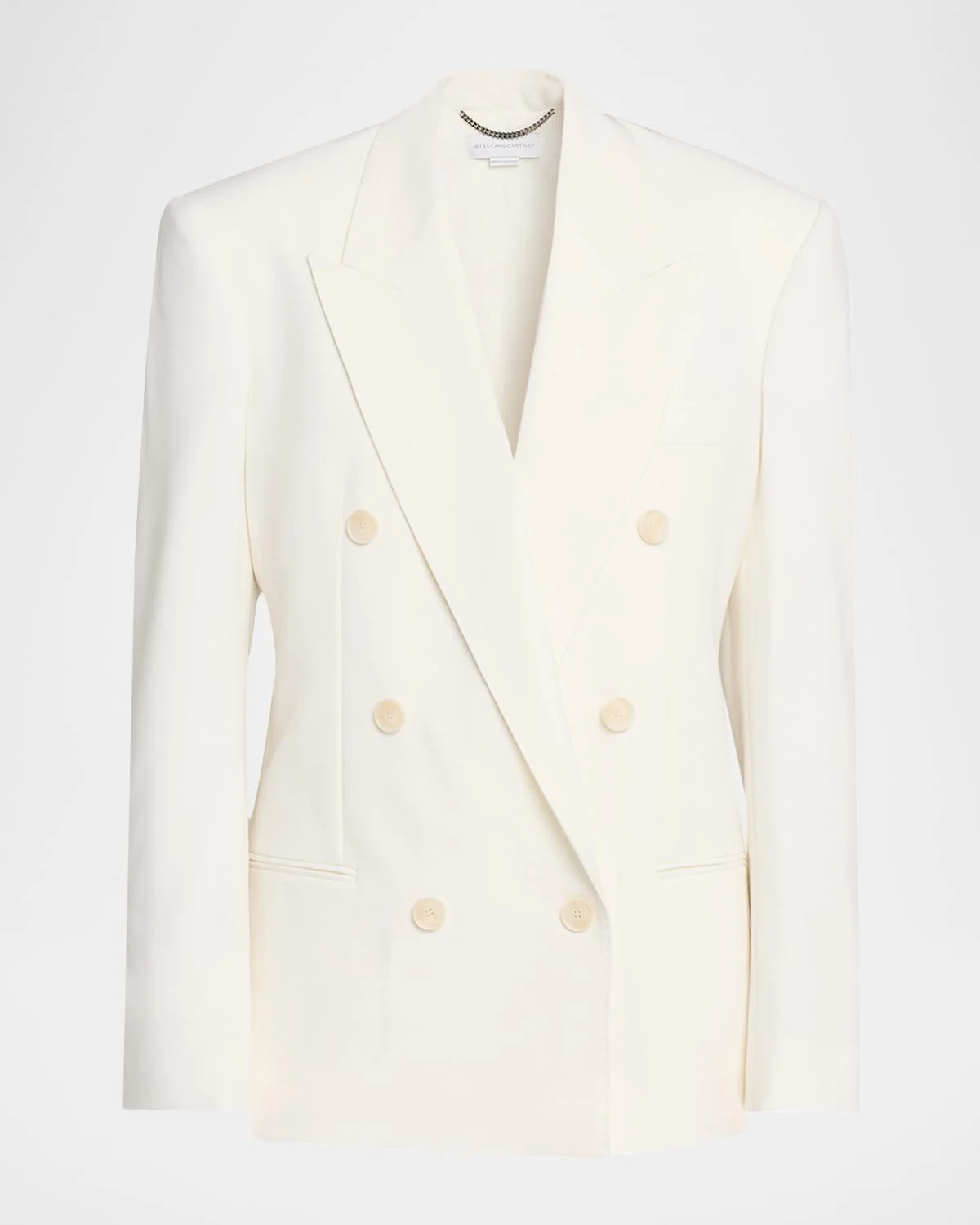 Tailored from wool canvas, this Stella McCartney tuxedo blazer exudes the brand's signature masculineyetfeminine perspective with a doublebreasted silhouette Peak lapels Long sleeves; fourbutton cuffs Padded shoulders Chest welt pocket Two hip welt pockets Oversized fit Button front closure Wool Lining: Viscose Dry clean Made in Italy
