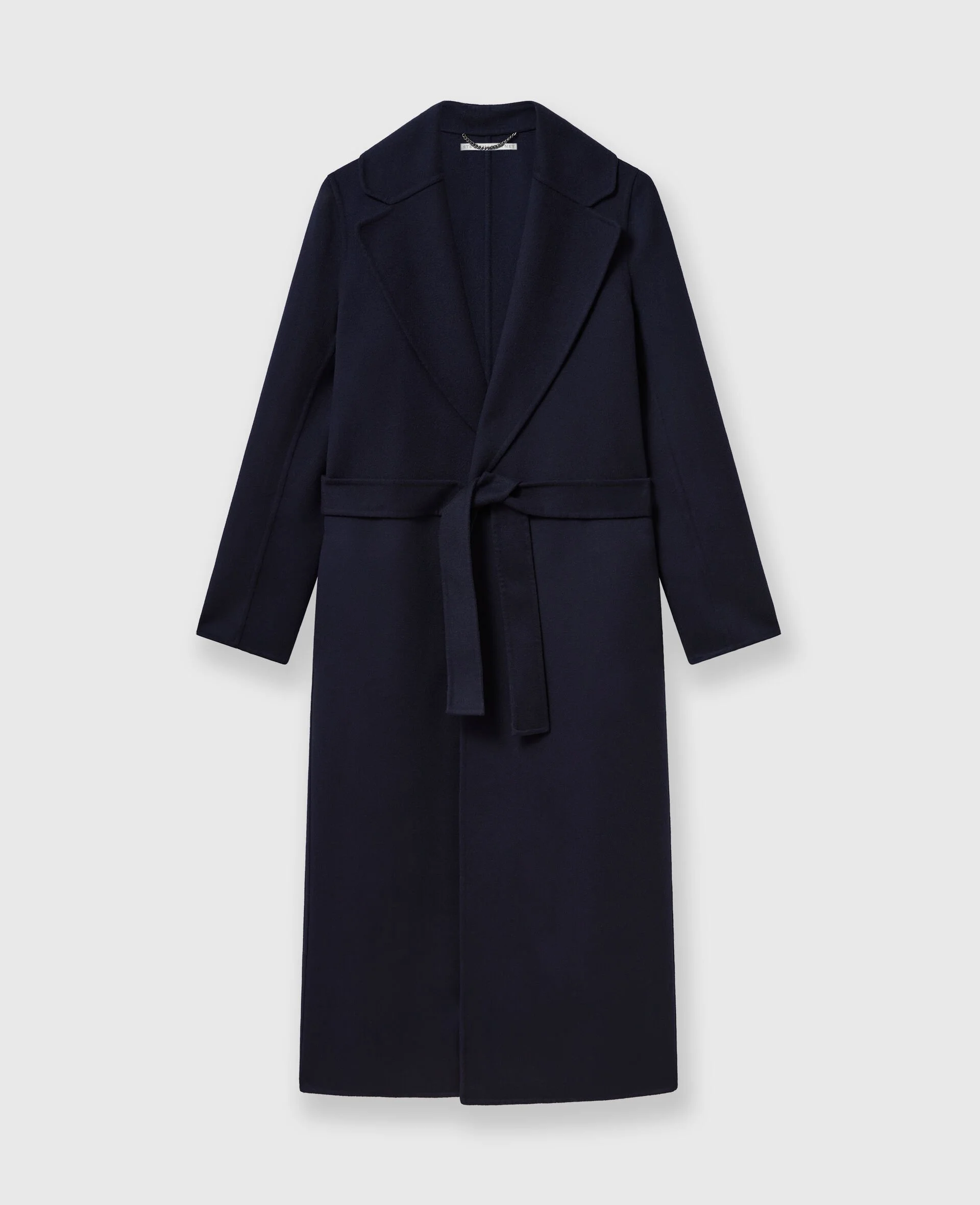 Item 660111SPB054101 This double-faced wool trench coat from Spring 2025 makes a grand statement with a large flat collar, peak lapels and waist-cinching belt. It is crafted from RWS wool, meaning it is fully traceable and has been produced to the highest ethical, environmental and social standards. - Color: Ink - Flat collar - Peak lapels - Adjustable wrap-around belt - Two side pockets - Made in Italy Product Care & Fit Advice Care: Dry clean only Composition: 100% Wool Fit: Regular fit Sizing: Take your usual size Heavyweight, non-stretch fabric Model is wearing a size 38